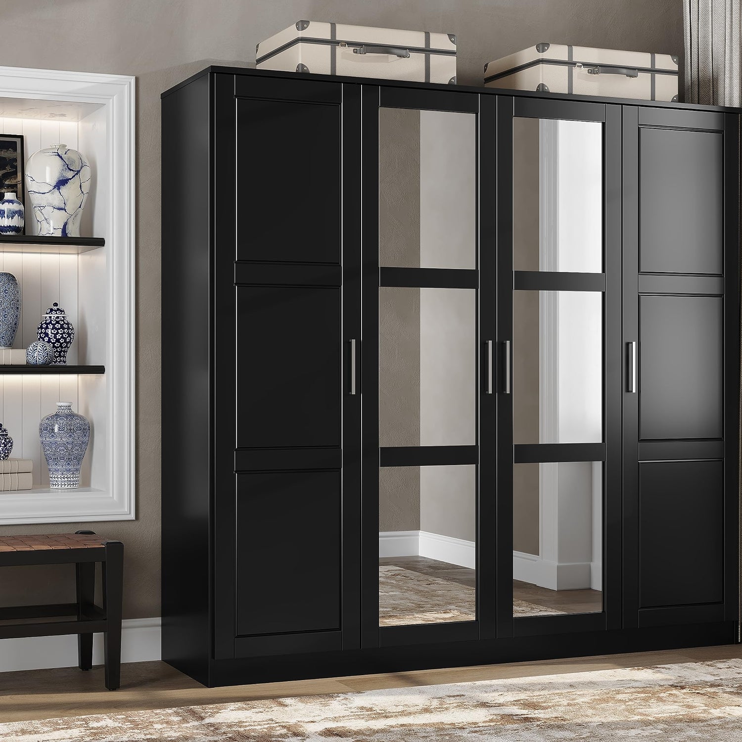 Palace Imports 100% Solid Wood Cosmo 4-Door Wardrobe with Mirrored Doors, Clothing Rods, No Shelves, Black, 74.5" W x 72" H x 20.75" D, Renewable Eco-Friendly Wood, Made in Brazil