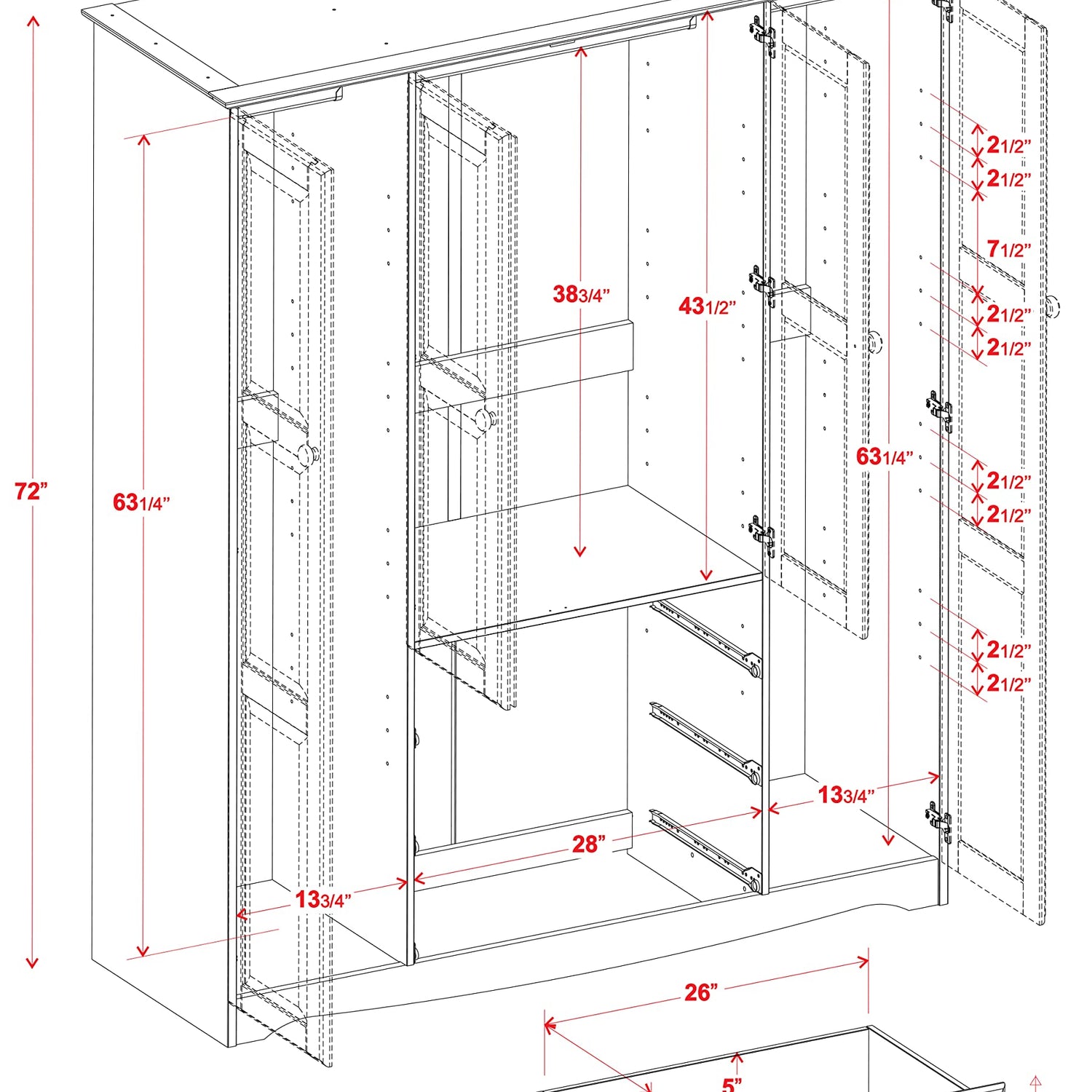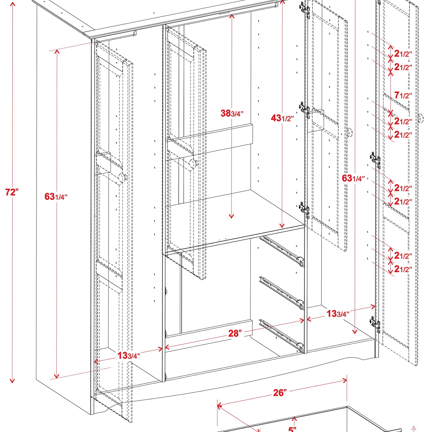 Details: At 60 inches wide, this Family wardrobe is the largest in the Palace Imports’ collection. As the name suggests, it has something to offer to the entire family. Two side compartments have clothing rods at the very top allowing long dresses or coats to be hung while the middle section can be used for your shorter pieces. No shelves are included for that reason, but If more storage space is needed for the folded garments, it can be expanded by adding up to three large and eight small adjustable shelves while a three-drawer mini-chest in the middle will store the smaller articles. The wardrobe’s functionality is enhanced by the aesthetics of the all wood construction. Hand painted pine is beautiful, silky smooth and practically knot-free. Available in four popular finishes it will likely match many interiors or other perfectly compatible in color and style furniture pieces designed by Palace Imports can be purchased.