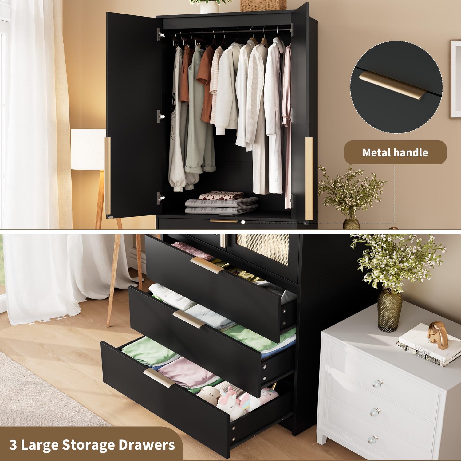 Senfot Rattan Armoire Wardrobe Closet with 3 Drawers and 2 Doors, Modern Wooden Wardrobe Cabinets for Hanging Clothes, Tall Standing Bedroom Armoires, Heavy Duty, Black