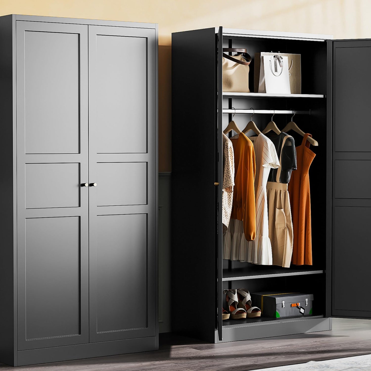 - ✔️【 Door with Magnets】: Door with Magnets keep the freestanding armoire wardrobe closet closed. Eye-catching Gold Handle provide fashion elements for food clothing storage cabinet.;