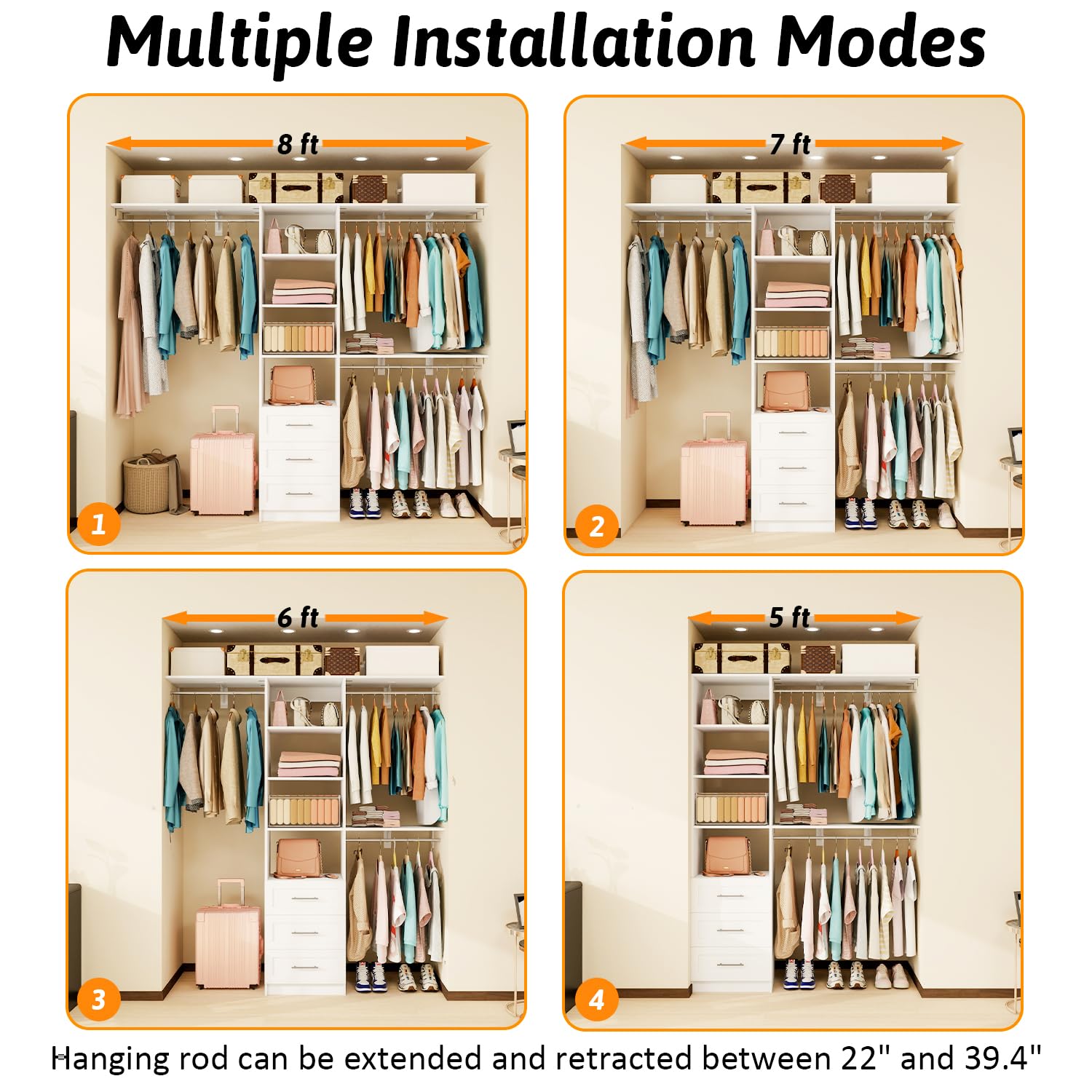 • ✅ 【Customize & DIY Walk-in Closet 5FT–8FT】 – This wood closet system with drawers comes with 3 adjustable shelves and 4 expandable hanging rods (22”–39.4”). Easily DIY and customize to fit any 5FT–8FT walk in closet space. Remove the lower rod to create extra tall space for long dresses or coats.
