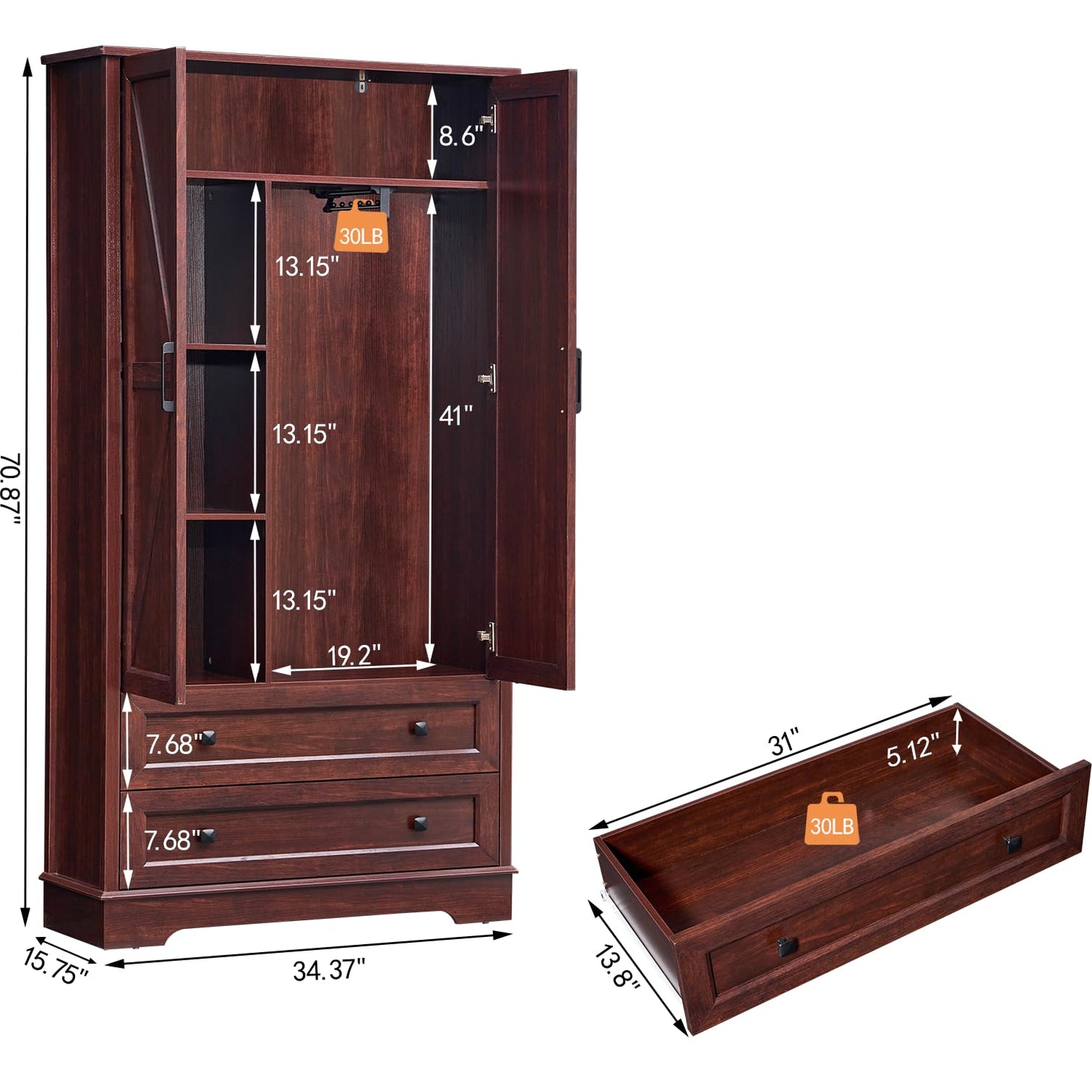 SOOWERY Cherry Wood Dresser for Bedroom, 2 Drawers Farmhouse Wood Wardrobe with Multiple Storage, 71 Inches Tall Armoire for Bedroom, Living Room, Hallway