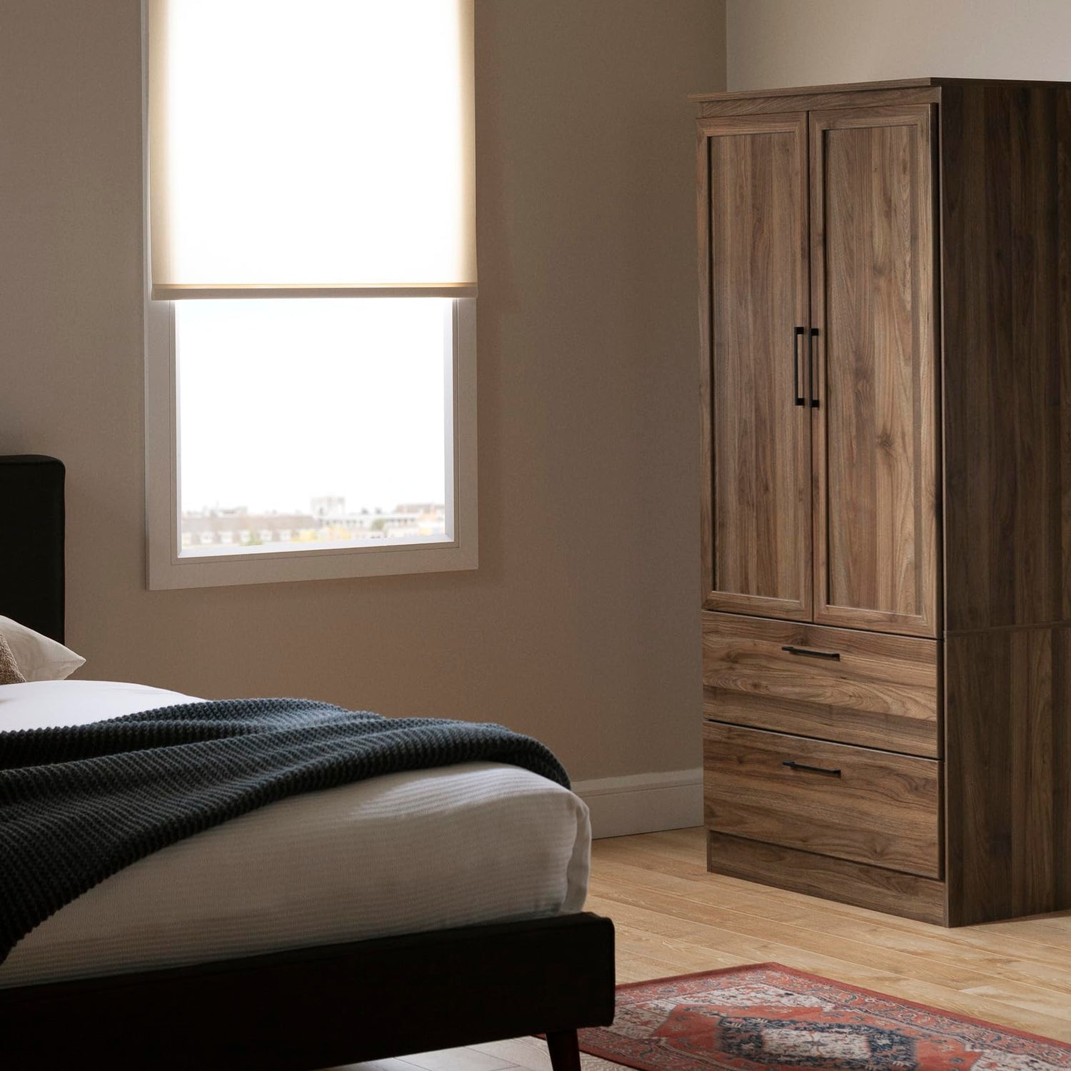 - A STYLISH CONTEMPORARY PIECE: The framed doors and elegant metal handles give this tall piece a classic look that’ll never go out of style. This wardrobe will blend easily into your bedroom decor.