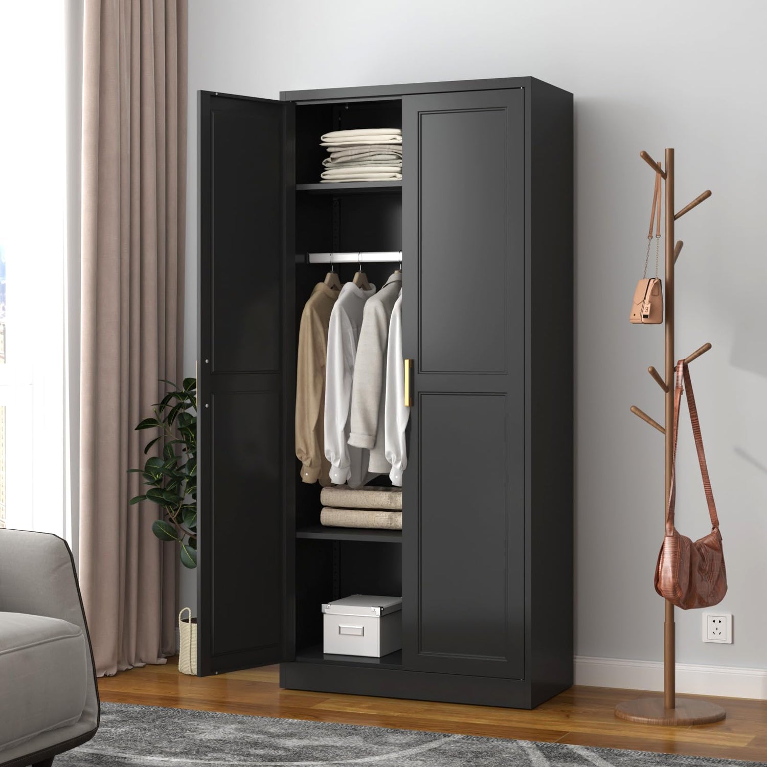 SteeLoong Metal Wardrobe Cabinet with Hanging Rod, 71" Tall Armoire Wardrobe Closet with 2 Doors and Adjustable Shelves, Black Clothing Storage Cabinets for Bedroom, Laundry Room, Cloak Room