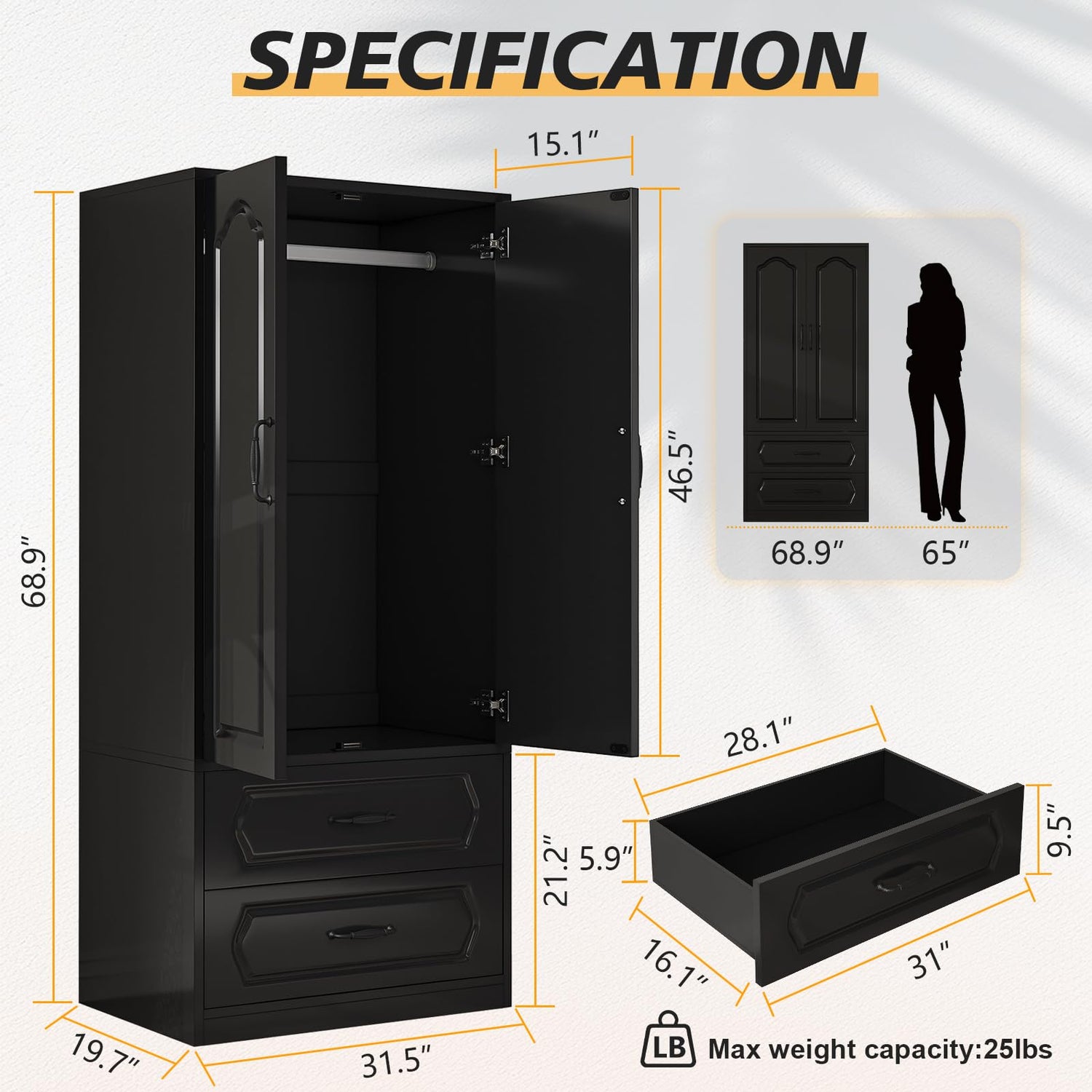 Swpormundo Wardrobe Closet with Drawers and Hanging Rod, 70" Wooden Wardrobe Closet with 2 Doors and 2 Drawer, Armoire Clothing Storage Cabinets with Smooth Slide for Bedroom, Dorm, Cloak Room (Black)