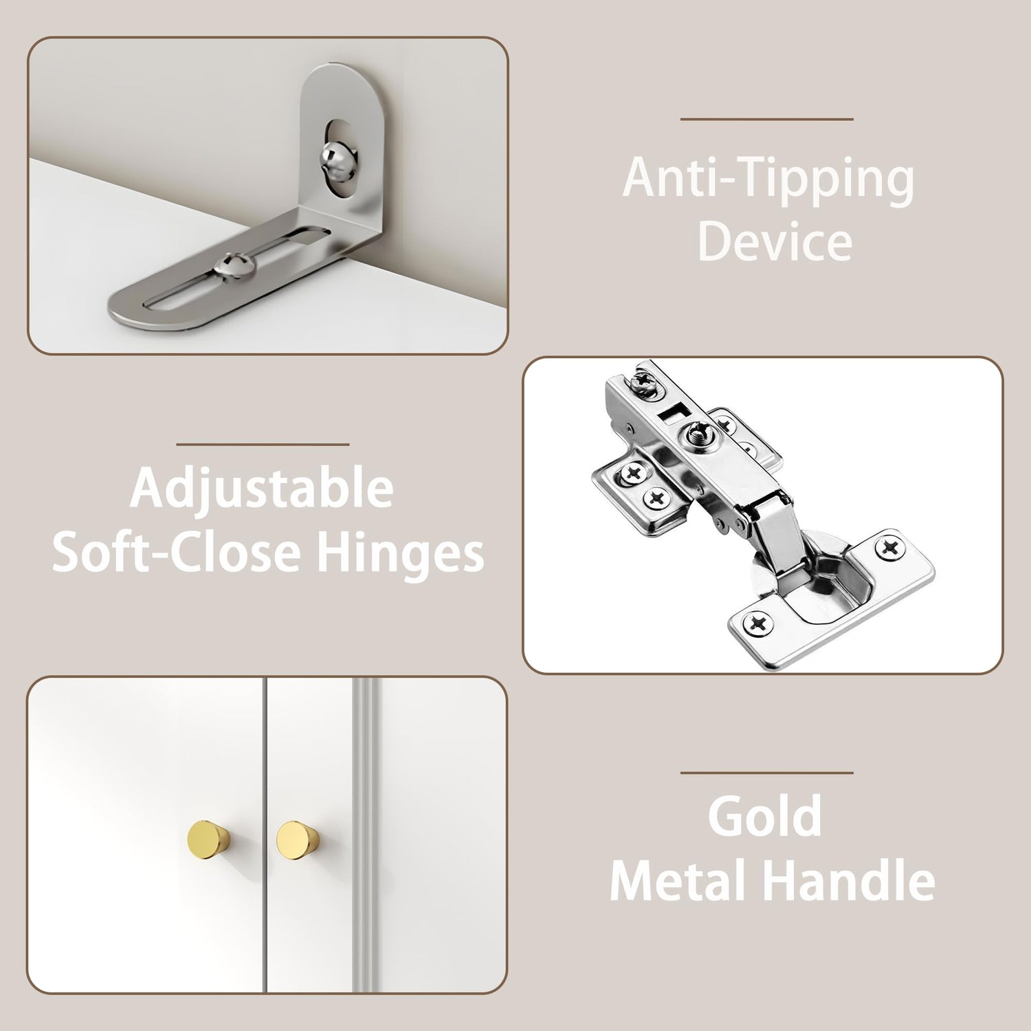 - Durable and Reliable Materials: The white armoire with shelves and drawers is crafted from high-quality, thick engineered wood, perfectly combining sturdiness and elegant design to provide a long-lasting bedroom storage solution. Its scratch-resistant, easy-to-clean surface maintains a polished look for everyday use. Adjustable soft-close door hinges ensure smooth and quiet operation. The wooden closets for bedroom come with anti-tip hardware to securely anchor the wardrobe to the wall, offering extra safety for homes with children or pets.