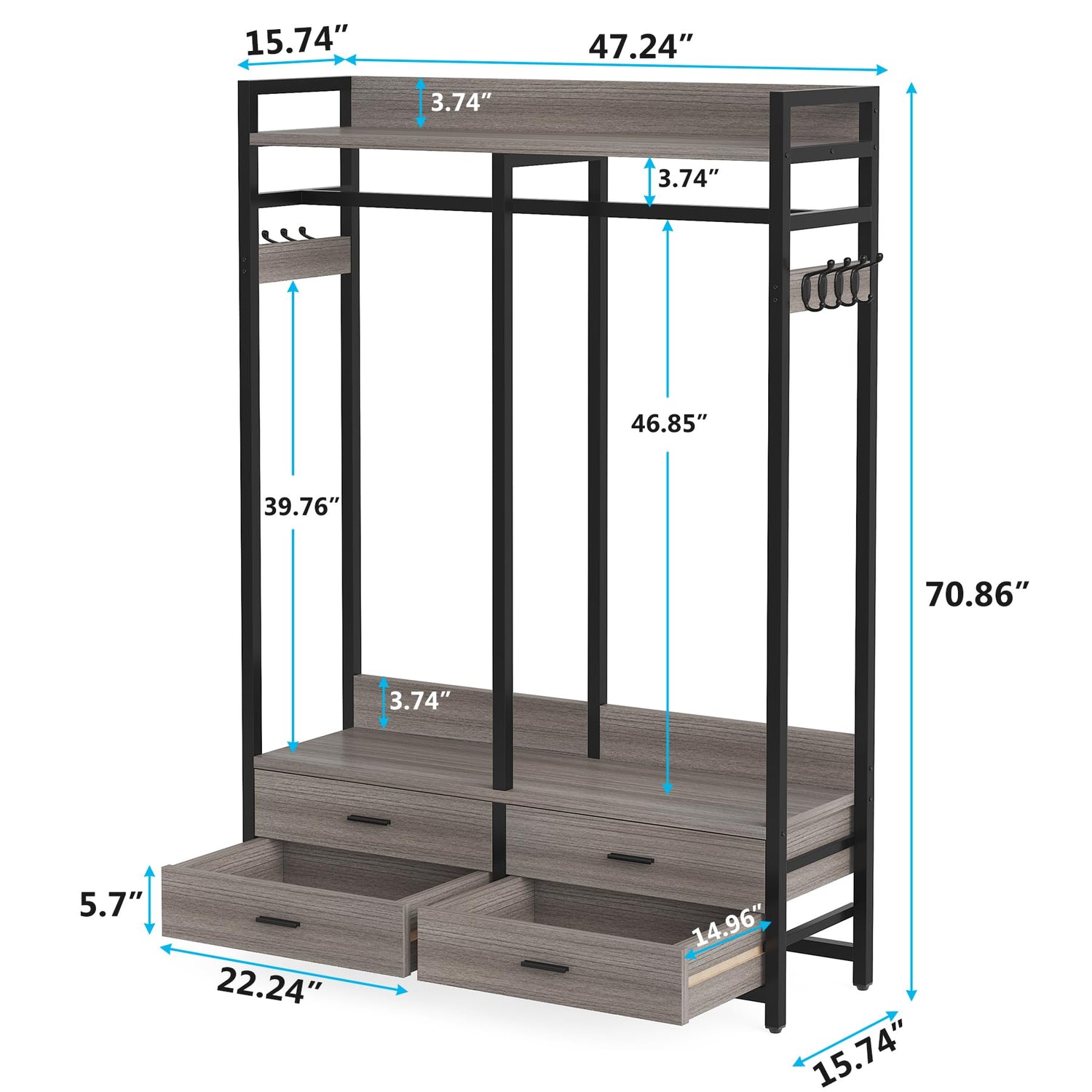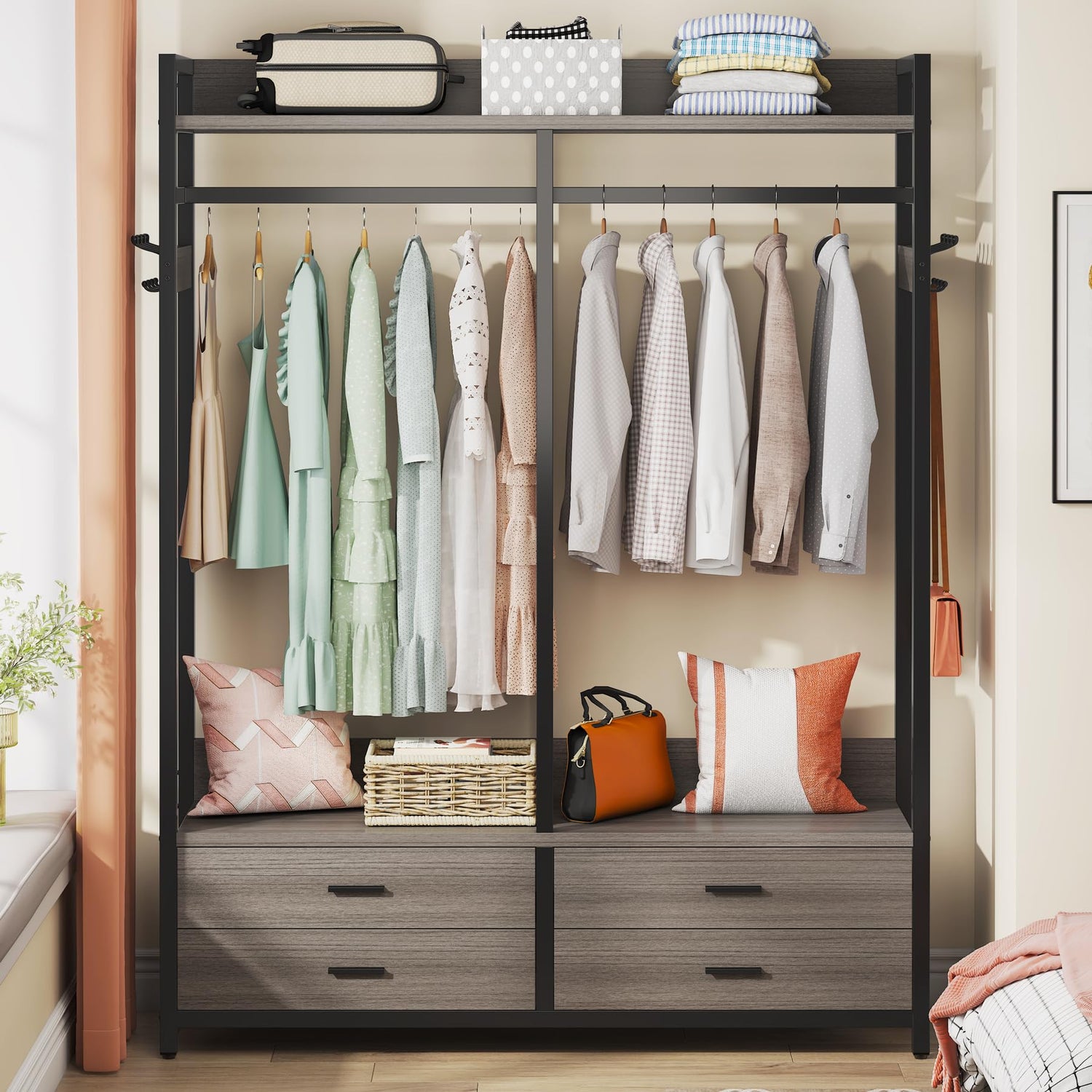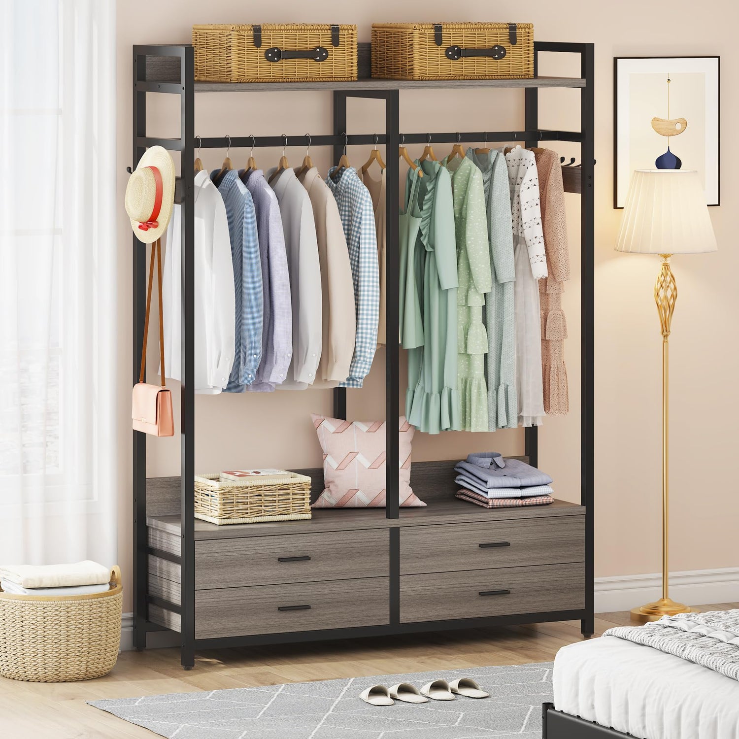 Tribesigns Freestanding Closet Organizer for Hanging Clothes, Heavy Duty Garment Rack with 4 Drawers, 8 Hooks and Storage Shelves, Wardrobe Closet Clothing Rack for Bedroom, Living Room, Grey