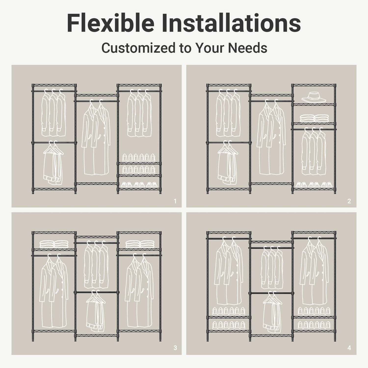 • Sturdy Closet Rack: VIPEK V5LC Covered Garment Rack comes with 8 adjustable Shelves & 4 removable hanging rods, it's possible to configure in different ways. Assembly was quick and easy. Raise or lower the shelving to customize the Well-Organized wardrobe closet of your dreams, and MAXIMIZE YOUR SPACE! Made of high quality iron, it features stable and sturdy; all metal parts are powder-coated which protects sturdy clothes rack from water and rust to ensure years of use.