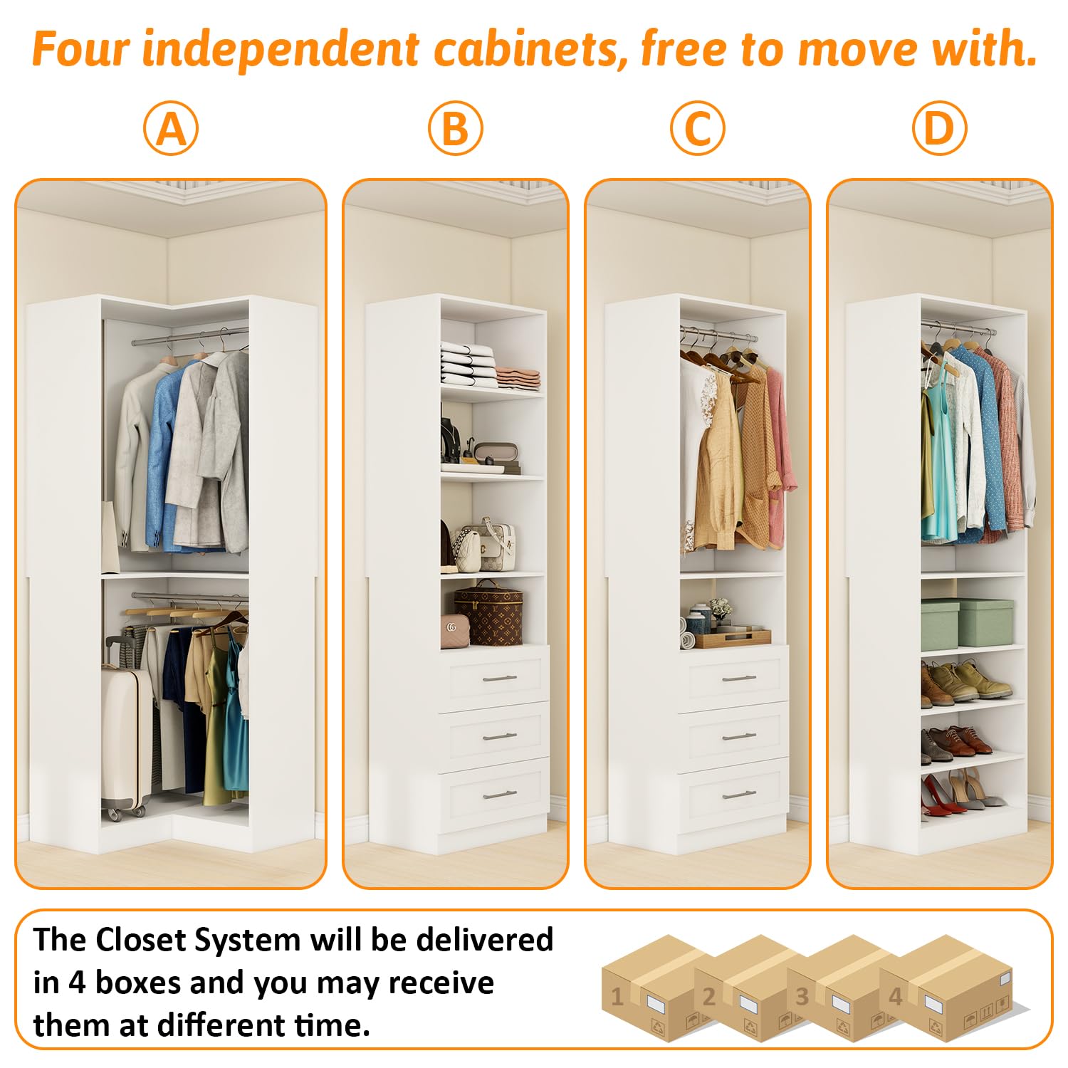 Vomavex Closet System with 4 sets, 101.9" Closet Organizer Systems with 6 Drawers & 8 Hanging Rods & Adjustable Shelves, Walk in Closet Standing Closet System, Corner Closet System Set, White