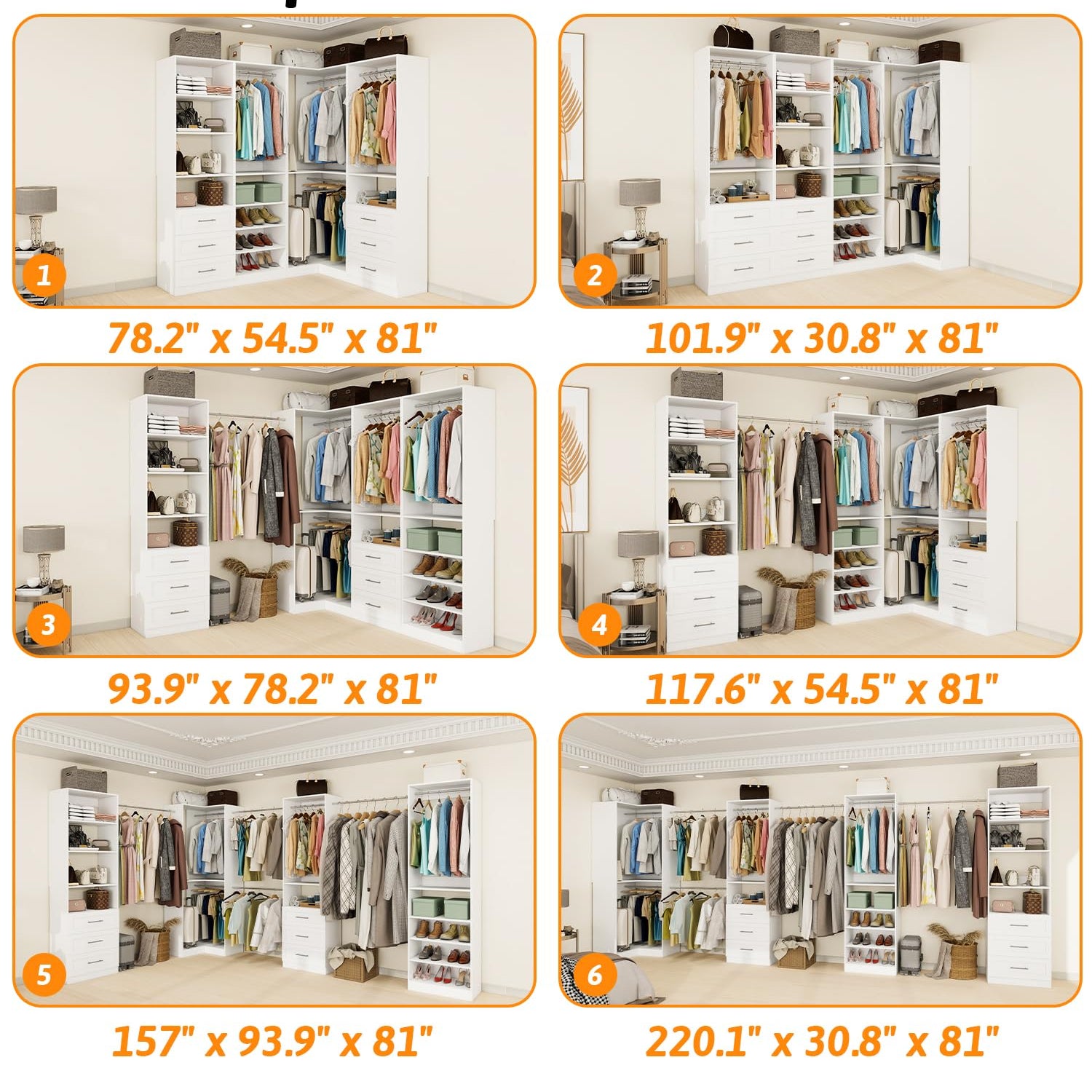 - 【 4-in-1 Closet System, Custom/DIY as you like】- This Closet System sets includes 4 Separate closet Units: One Corner Closet system and 3 other Styles independent units with 6 Wooden Drawers and a lot of Adjustable Shelves and totally 8pieces hanging Rods. And you can customize it to be Dreamy Long or L Shape or U shape to fit your walk in Closet Perfectly for organizing (T shirt, Jackets, Coats, Outerwear, Dresses), shoes, Accessories, bags, suitcases, Toys, Bedding, and more. Say goodbye to clutter and enjoy a neat, easily accessible storage solution.