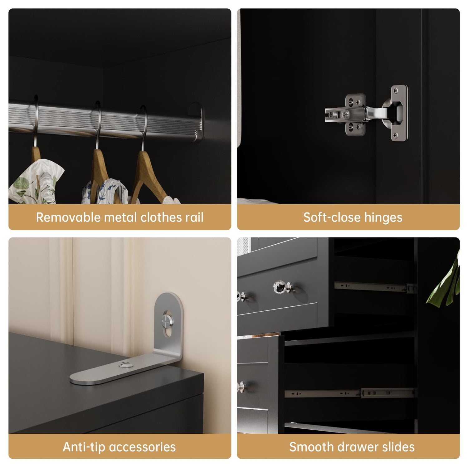 - Sturdy and Durable: Crafted from high-quality engineered wood, this bedroom wardrobe closet is built to last. Also comes with an anti-tip device to prevent accidents. The cabinet doors use cushioned hinges to reduce collisions and ensure long-term use.