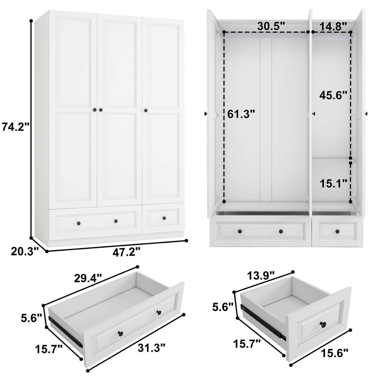 - Clever Design: The bedroom closet cabinet has dimensions of 20"D x 47"W x 74"H, making it a perfect fit for spaces of various sizes. The black round handles and silent sliding drawers of the white armoire wardrobe closet with drawers not only make it smoother to use but also bring a peaceful experience to your home environment. The top design of the armoires and wardrobes provides space for storing boxes and other items, cleverly utilizing every inch of space for more efficient storage.