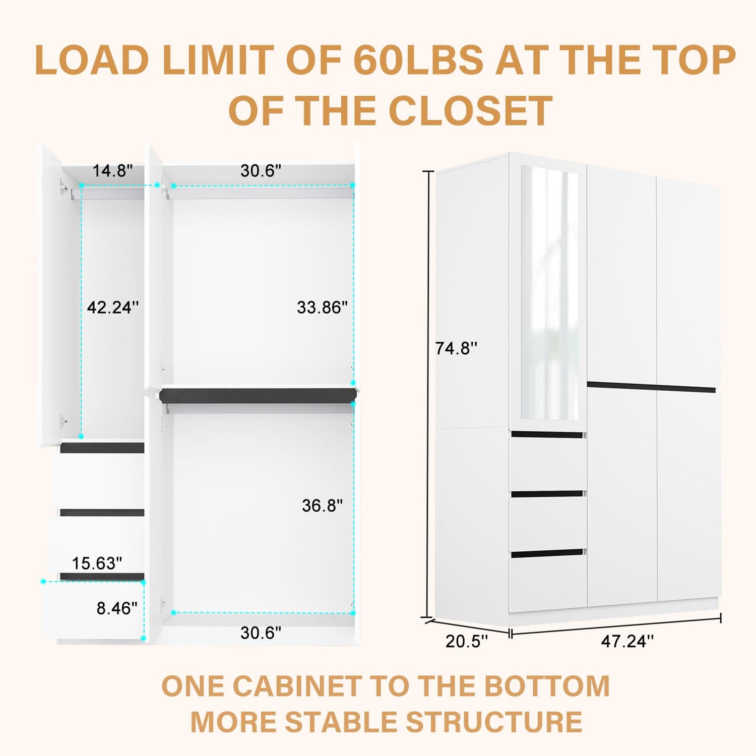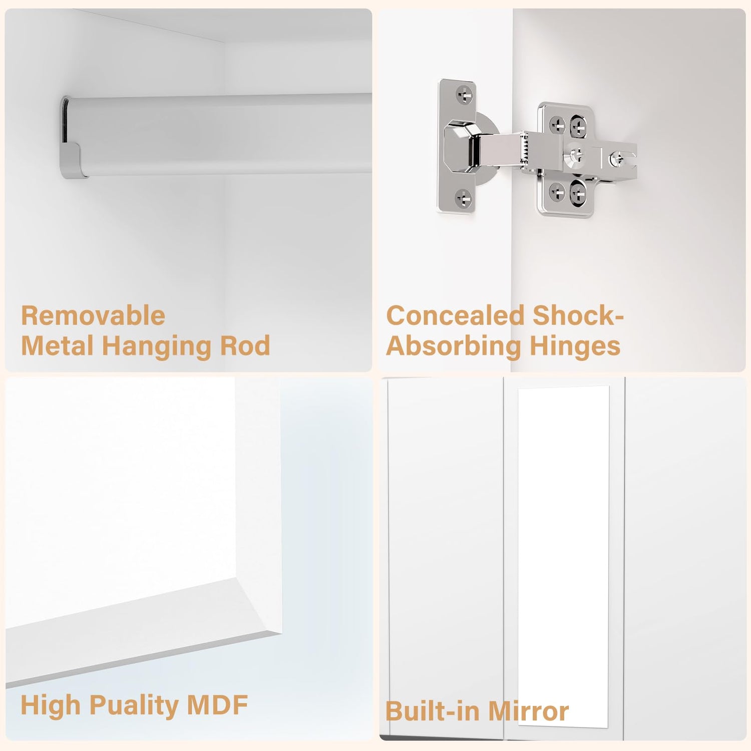 - 【Soft-Close Mechanism & Half-Length Mirror Inlay】 Soft-close hinges with damping force ensure the doors close slowly, quietly, and smoothly, acting as effective door brakes. The top of the wardrobe features a half-length mirror for convenient outfit selection.