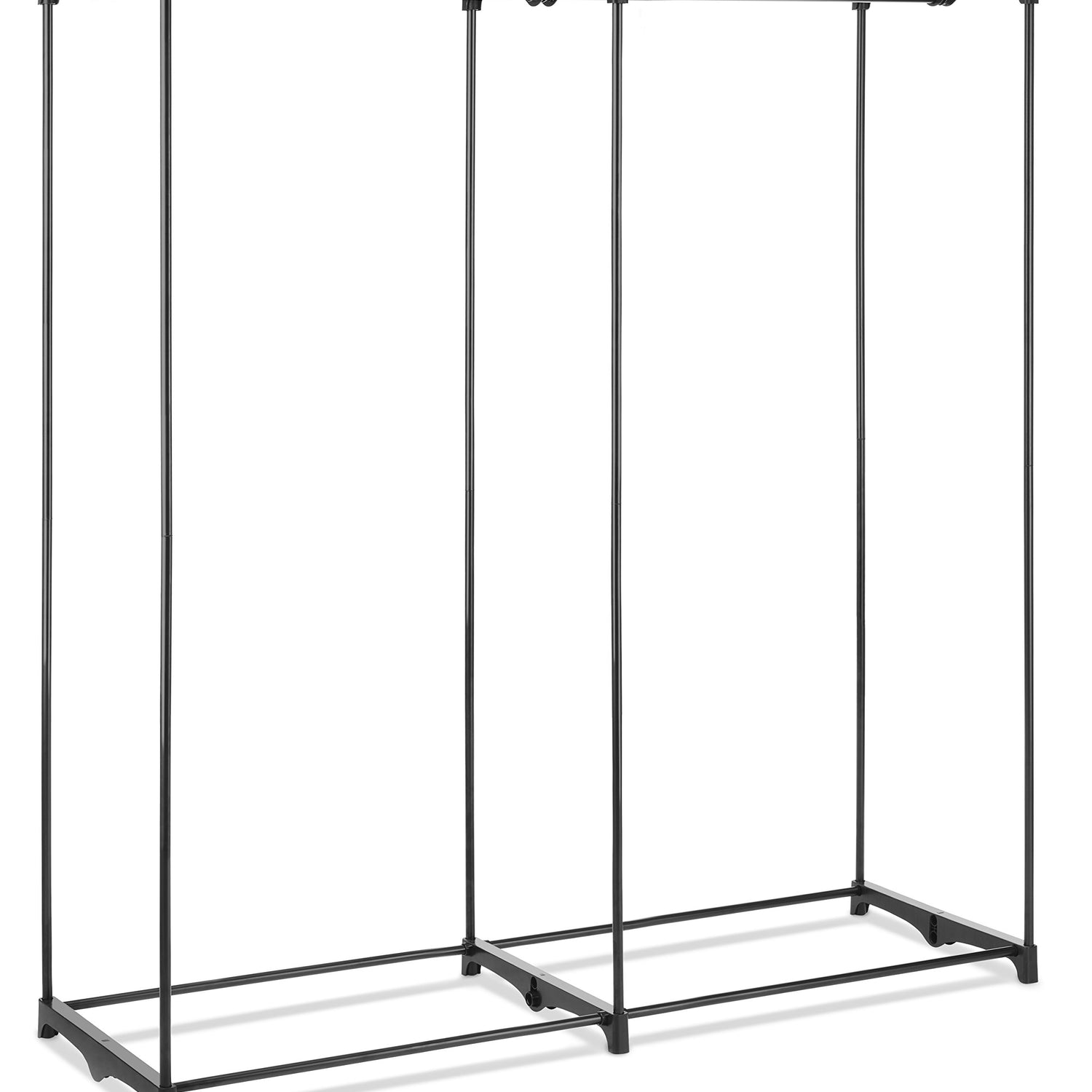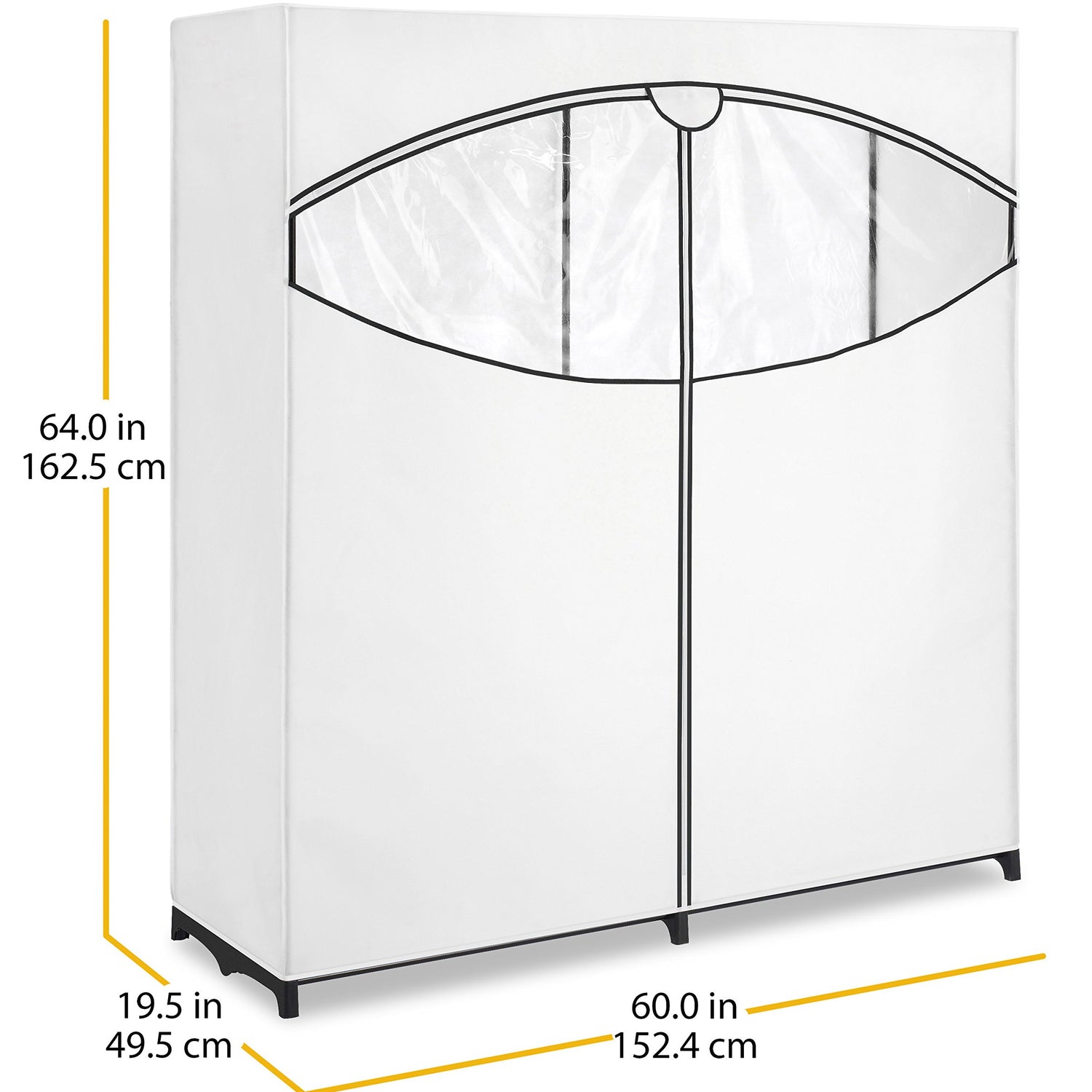 Whitmor's perfect solution for your clothes storage needs. This new and improved 60-Inch extra wide stand alone clothes closet has a sturdy heavy-duty zippered front for convenient, trouble-free access. New easy assembly uses a durable bungee cord system and improved, sturdier plastic connectors. Heavier weight white polypro cover has added blue trim and a larger clear window to view contents in closet. More clothes can be stored because of added wired support for the 60-Inch closet rod. Assembled size: 19-1/2-Inch W by 60-Inch L by 64-Inch H.