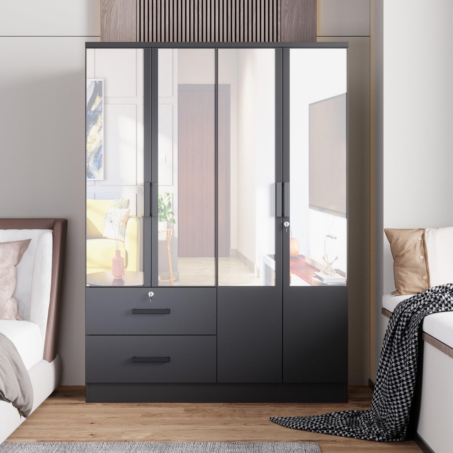 Woodpeckers Furniture And Mattress 4 Mirrored Doors Wardrobe 2 Drawers with Shelves 72 high (4 Mirrors, Black)