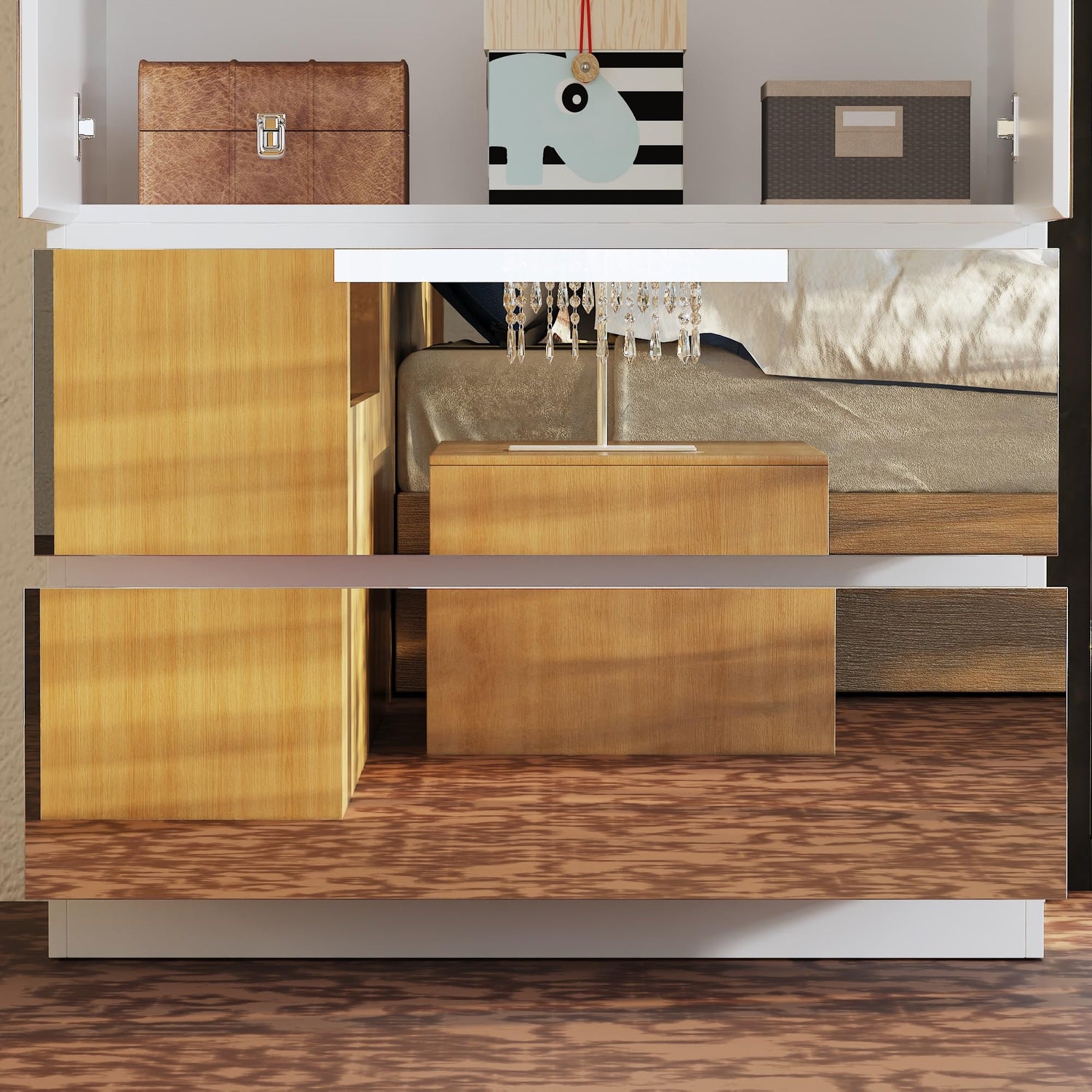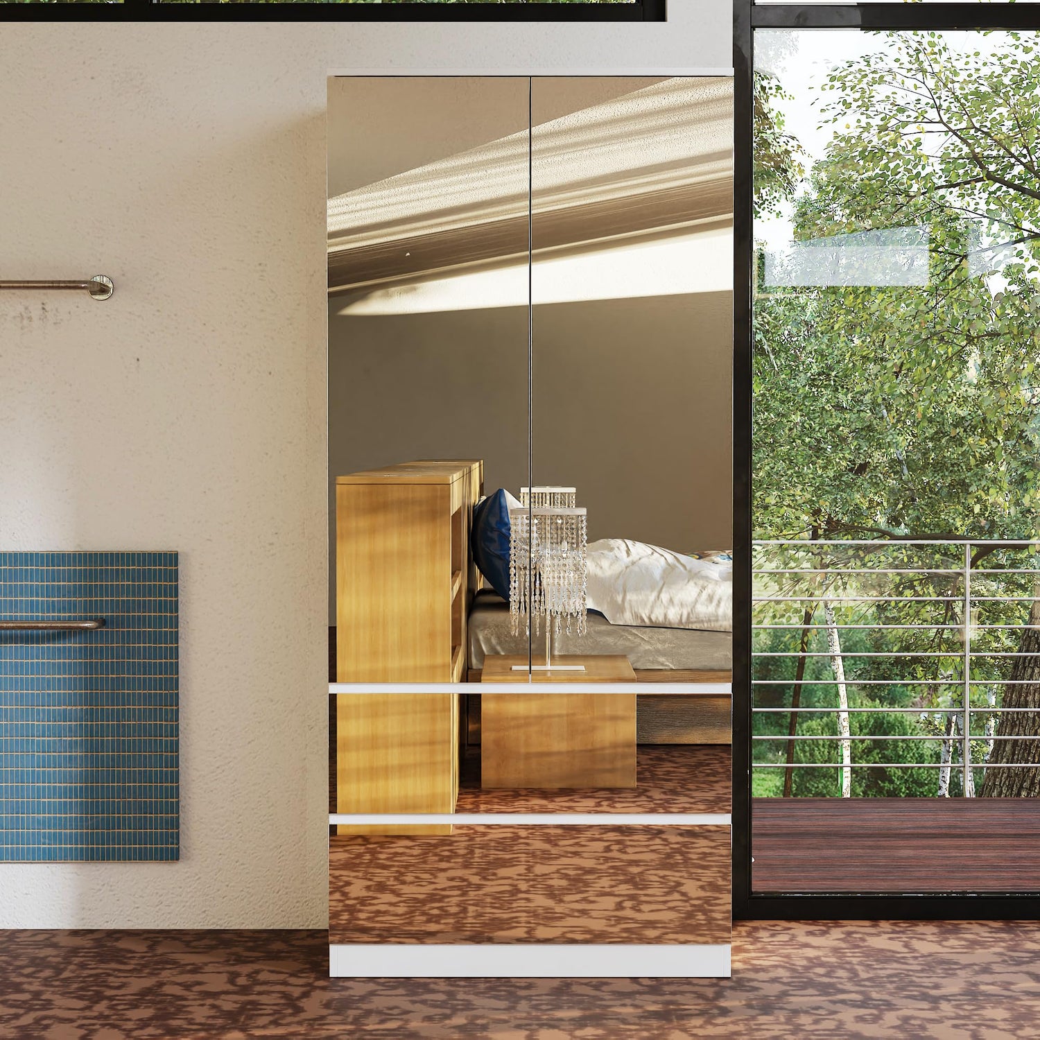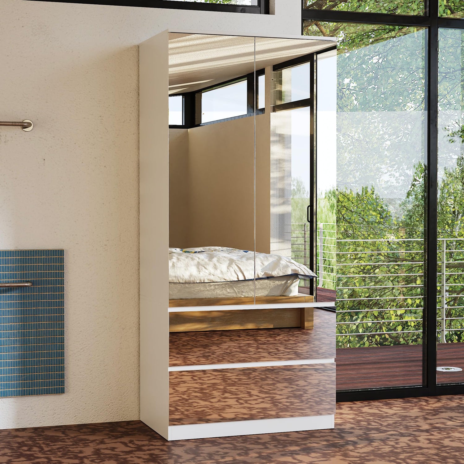 WOODTIME Wardrobe Closet with All Mirror, Wooden Armoire with 2 Doors, 2 Drawers & Hanging Rod, Clothes Storage Cabinet Organizer for Bedroom Apartment, White
