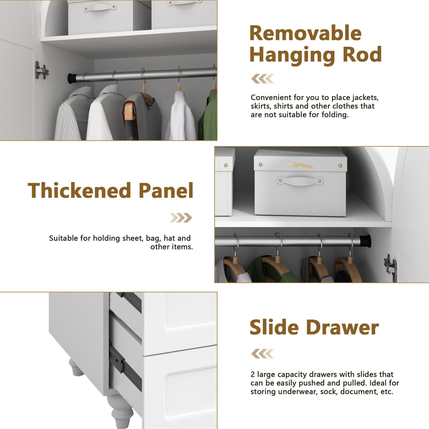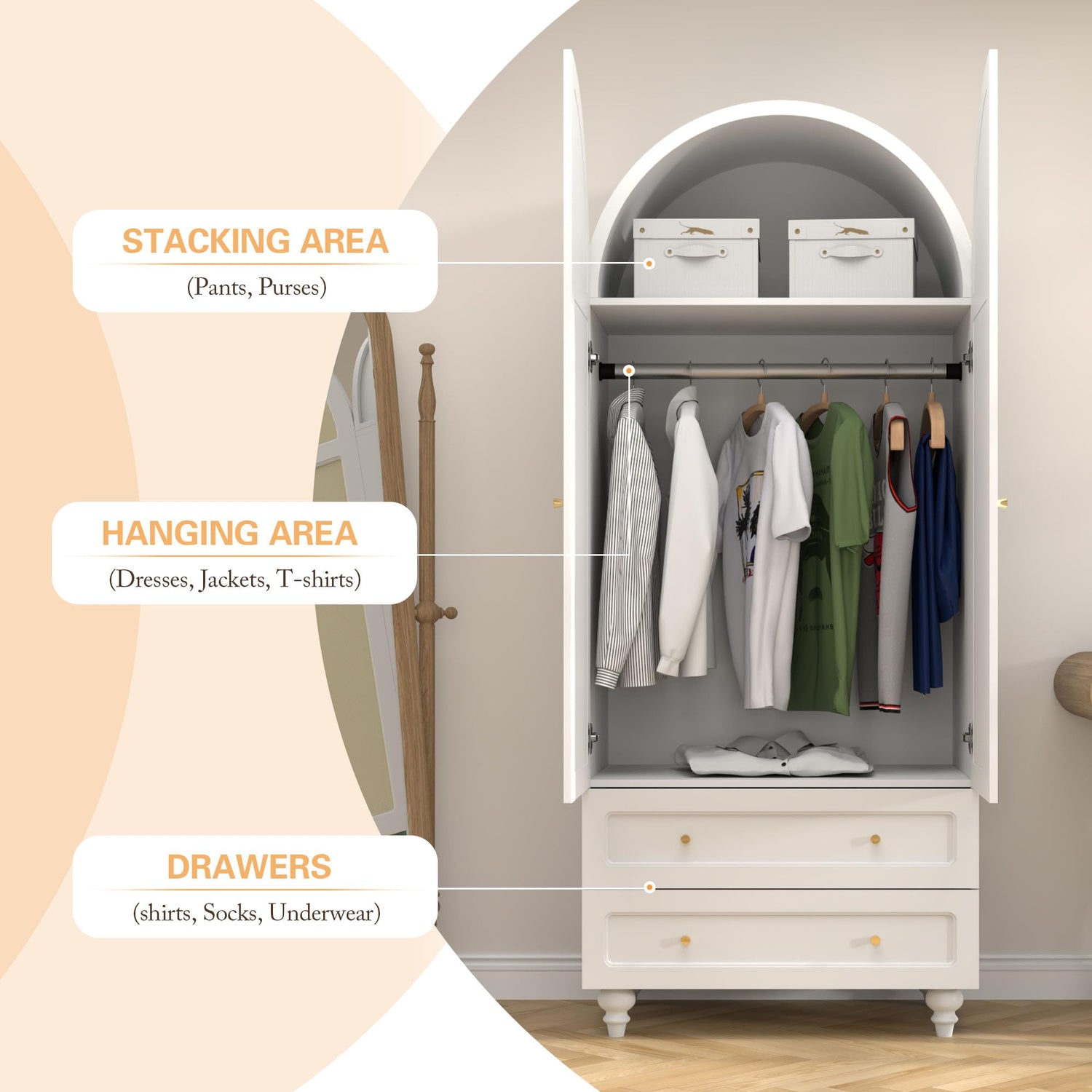YUCHIATH Arched Armoire Wardrobe Closet with 2 Rattan Doors, Wooden Wardrobe Closet with 2 Drawers, 74.8 "H Bedroom Armoires with Hanging Rod (White)