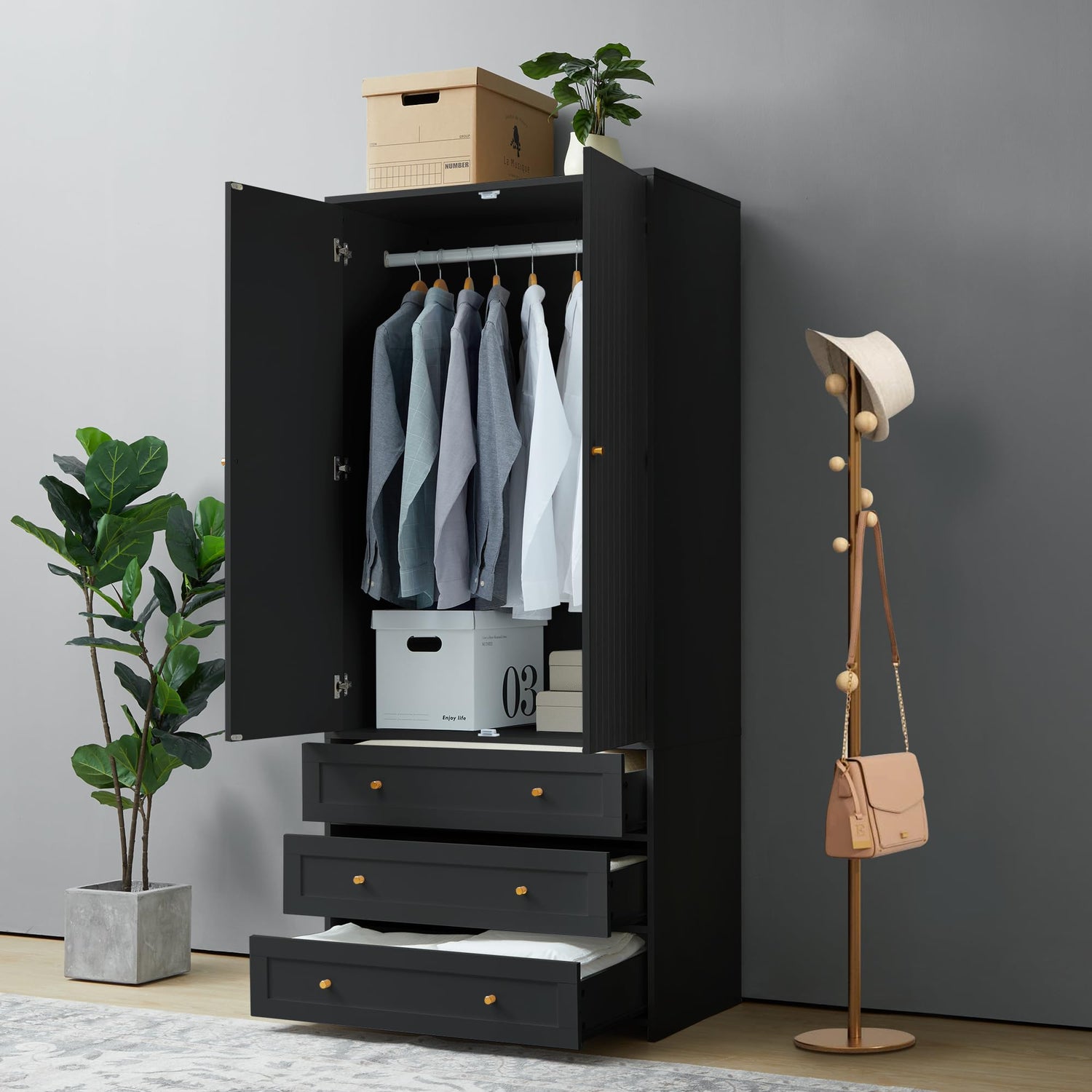 - 【Versatile Wardrobe Cabinet】Designed for versatile use in living rooms, bedrooms, offices, or as storage lockers/file cabinets, this space-saving wardrobe maximizes storage capacity without sacrificing floor space. Its compact structure streamlines organization and ensures effortless access to all your belongings