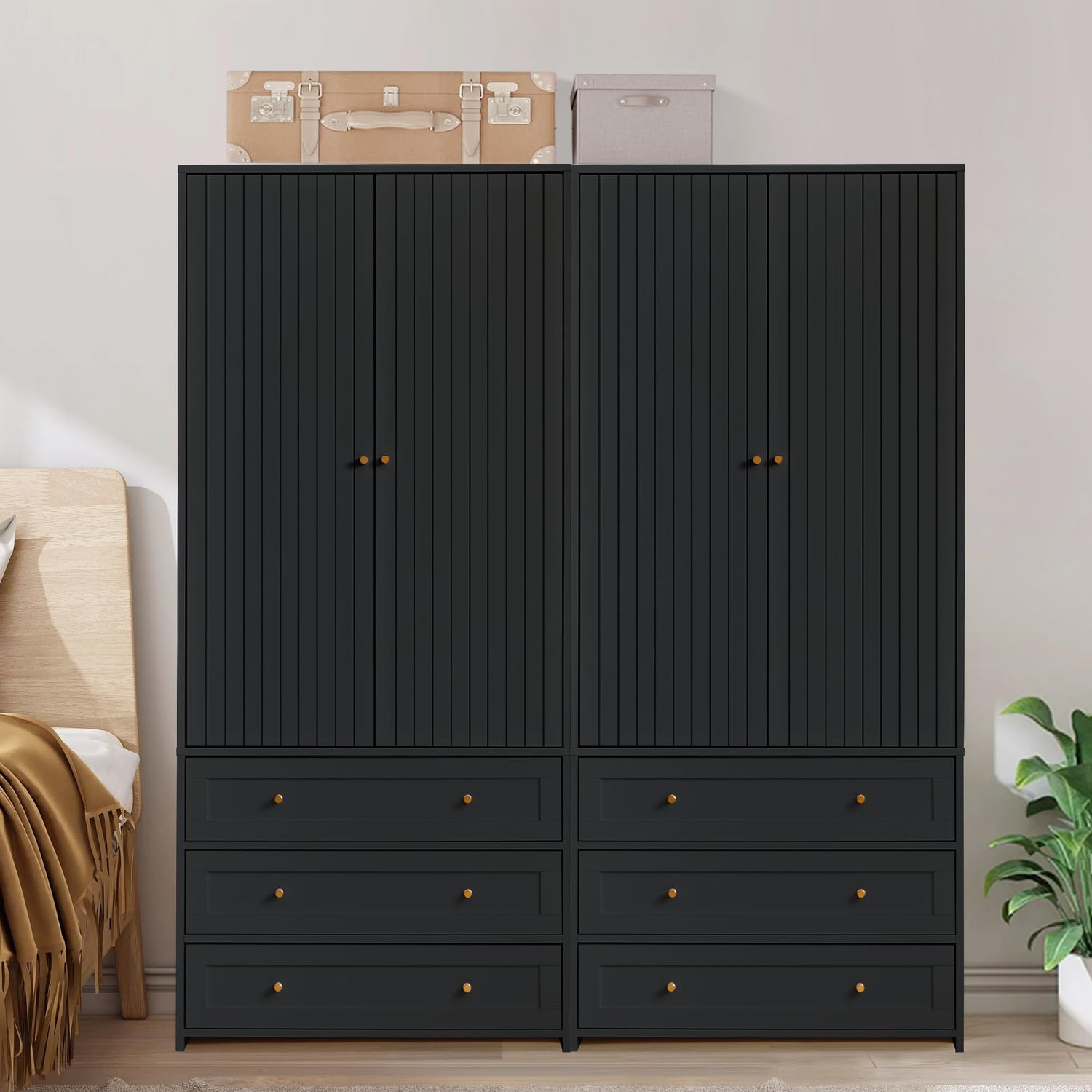 YZRSTY Armoire Wardrobe Closet with 4 Doors and 6 Drawers, 70.87" Tall Wooden Clothes Closet Wardrobe Cabinet, Freestanding Bedroom Storage Armoire for Hanging Clothes, 2-Piece (Black)