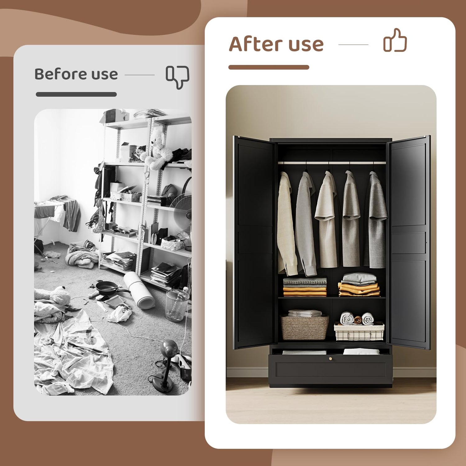 - 【Stable and Reliable】Two sturdy magnetic caps are installed on the wardrobe door to ensure safe closing and keep items from being affected by dust. The wardrobe is also designed with an anti-tilt mechanism, with pre-drilled holes on the back to facilitate secure wall installation and prevent unintentional tilting.