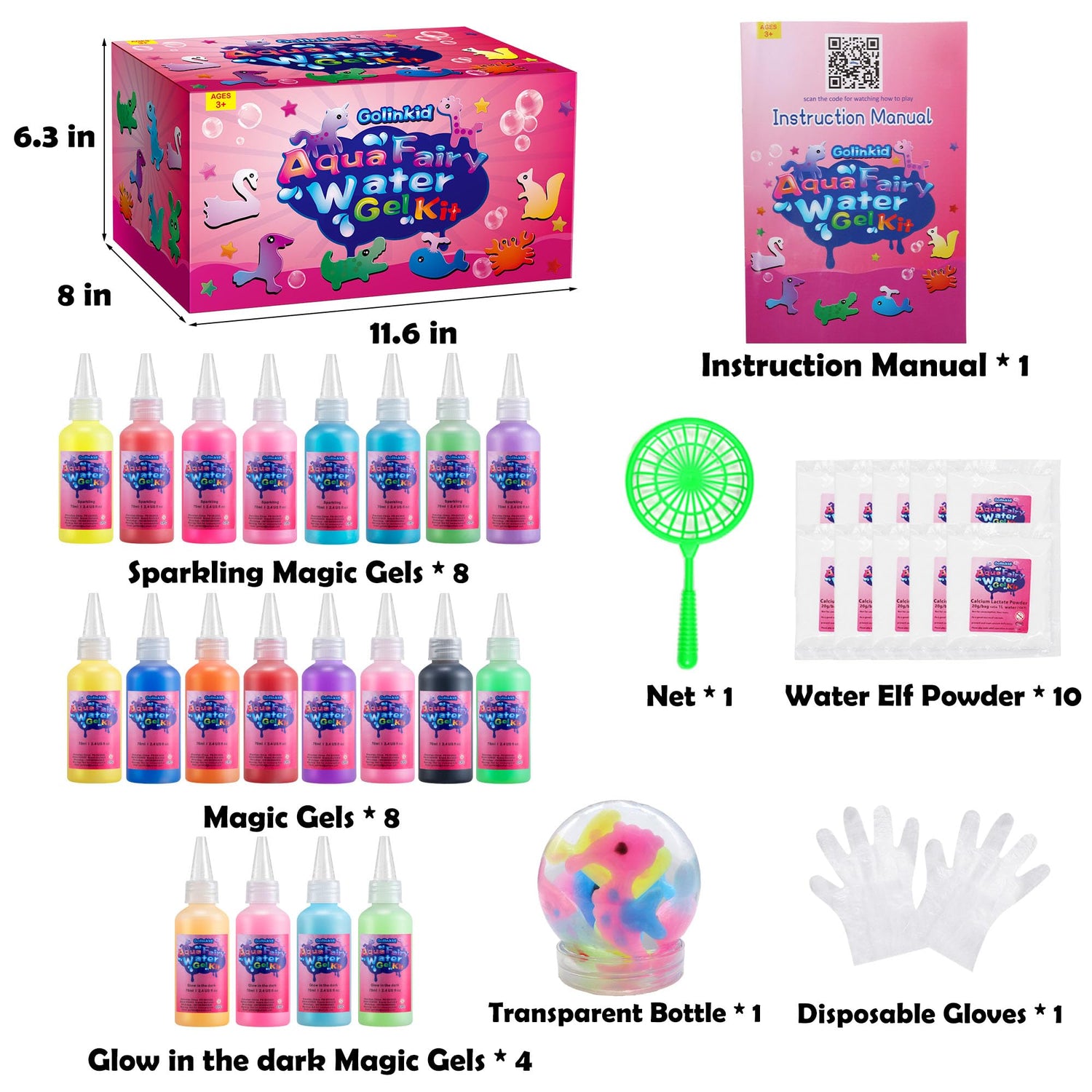 - 20 Bottles: Each bottle 70ml, Aqua Fairy Water Gel Kit, 8 bottles of Magic Gel, 8 bottles of Sparkling Magic Gel, 4 battles of Glow in the dark.