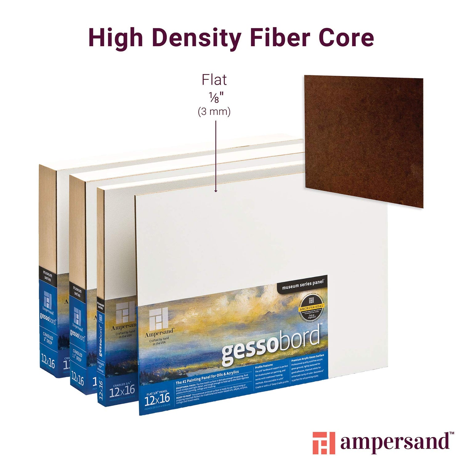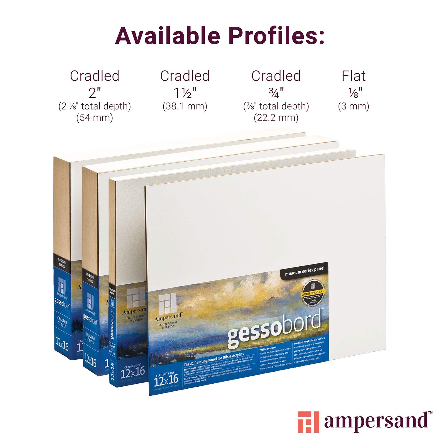 Details: Ampersand Art Supply's Museum Series Gessobord is a truly archival surface for oil and acrylic painting. Gessobord is made from our premium warp-resistant 1/8" profile FSC-Certified Hardbord that is sealed and protected with our proprietary Archiva-Seal to prevent yellowing from Support Induced Discoloration (SID). Each panel is individually coated with a professional artists’ grade acid-free acrylic gesso for a slight, even texture. Artists choose wood painting panels because the surface offers more vibrant colors, allows for precise detail and is an overall better support than canvas for their artwork. Ampersand panels are strong enough to hold up to the most rigorous palette knife painting and heavy layers of collage and will not bow or flex like canvas. Only Ampersand builds cradles by hand with premium-grade, 13-ply birch plywood for maximum stability and a clean, finished look from edge to edge. Choose from 3/4", 1 1/2" and 2" deep cradles, offering support and presentation all-in-one. Gessobord is perfect for oil, acrylic, palette knife painting, plein air, fine brushwork, mixed media, and is also a great surface for mounting papers, photos, giclee's and canvas! All Ampersand Museum Series Gessobord panels are eco-friendly, formaldehyde-free, and proudly handcrafted in the USA.