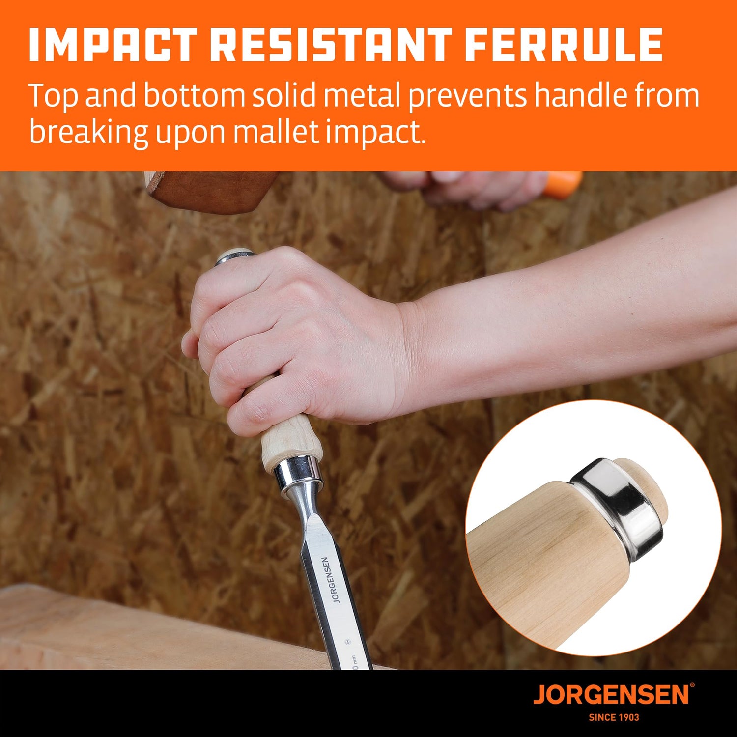 Jorgensen 4-Piece Wood Chisel Set, Chromium Alloy Steel Beveled Edge Wood Chisels, Wood Chisels for Woodworking, Ergonomic Hardwood Handle with Metal Ferrule, 1/4", 1/2", 3/4", 1"