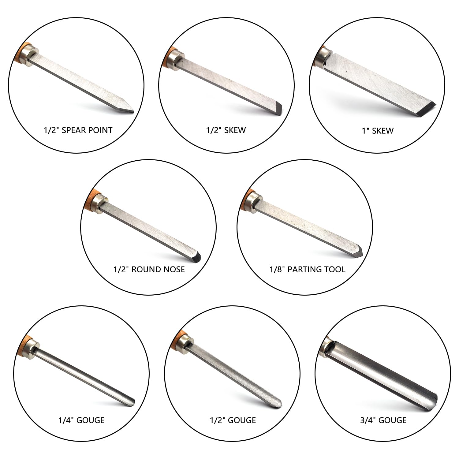- Comprehensive Set: This professional wood turning chisel set includes 2 skew chisels, 1 spear point chisel, 1 parting chisel, and 1 round nose chisel for all your woodturning needs.