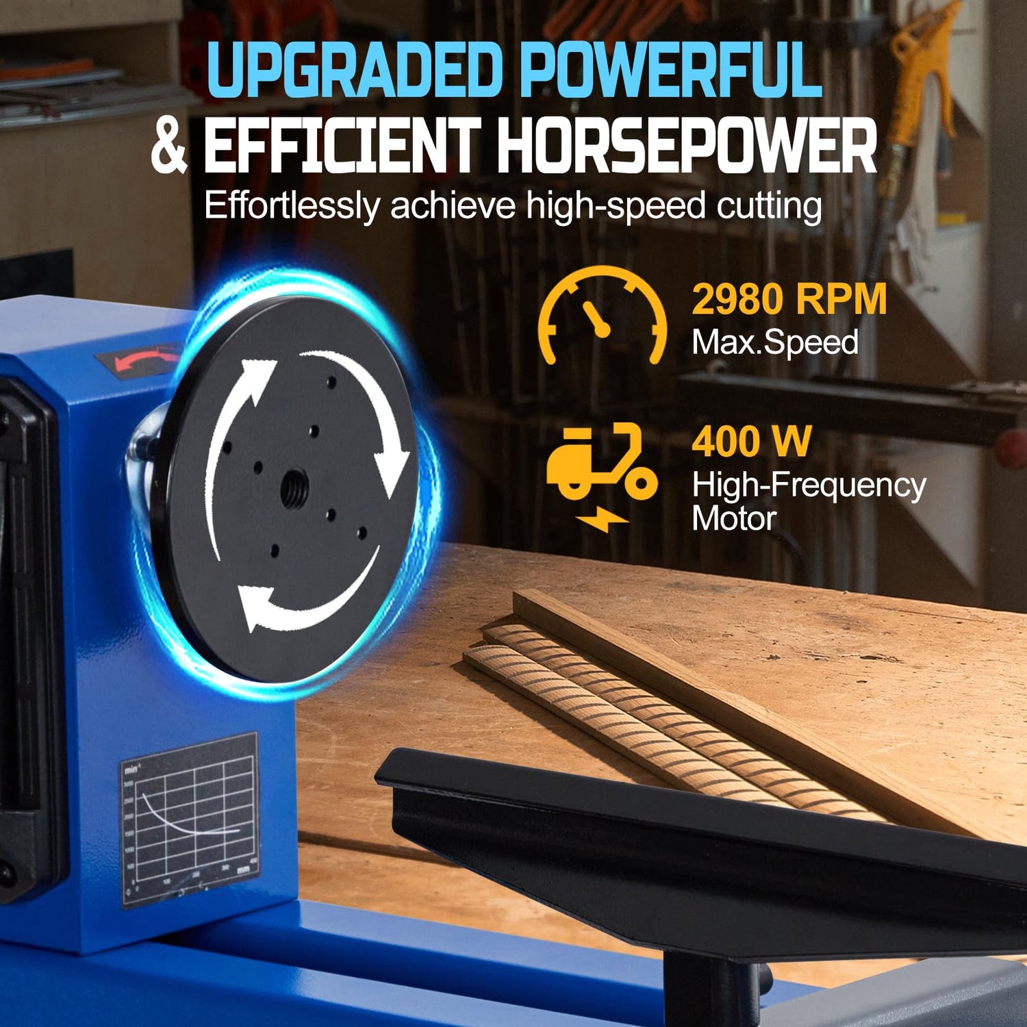 - 400W Powerful Motor: Equipped with a 400W 3.5-amp motor, this benchtop wood lathe offers more power than most 14-inch models, ensuring maximum security and low noise with its soft start feature. Voltage: 120V 60Hz.