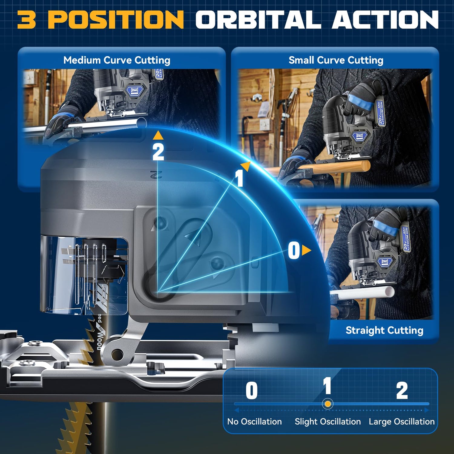 - Variable Speed & Precision Cutting: Achieve flawless cuts with variable speed control and 0°-45° bevel capabilities. The adjustable base pedal allows for easy miter cuts at 0°, 15°, 30°, and 45°. With 3 orbital settings, this cordless jigsaw cuts through wood (up to 80mm), steel (up to 8mm), and PVC pipe (up to 20mm) effortlessly. Enjoy precision and versatility for all your projects!