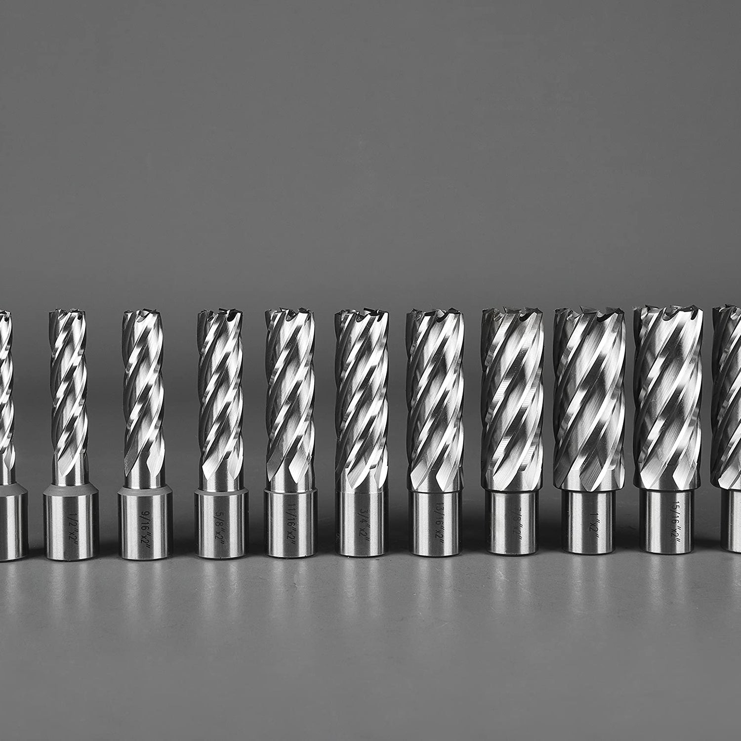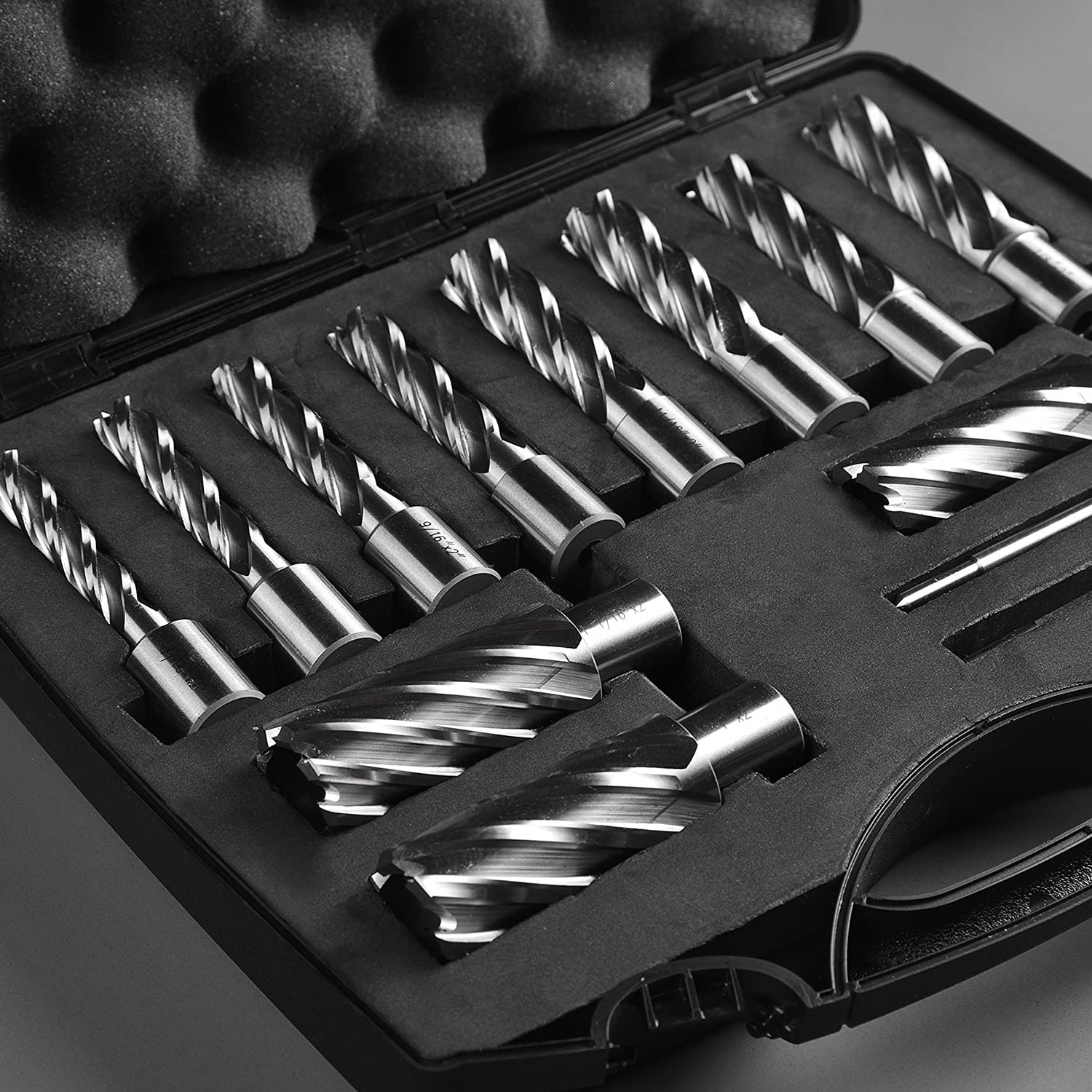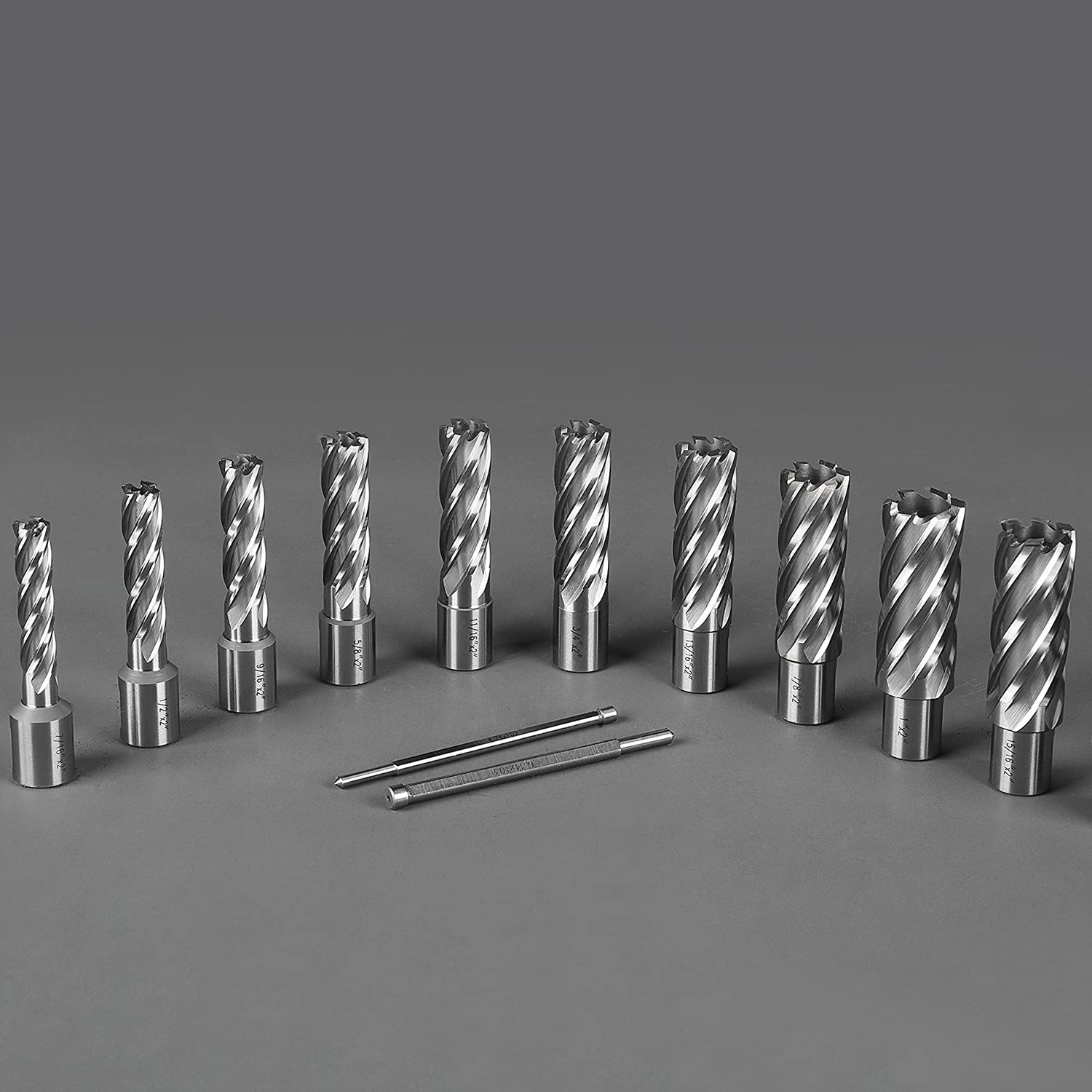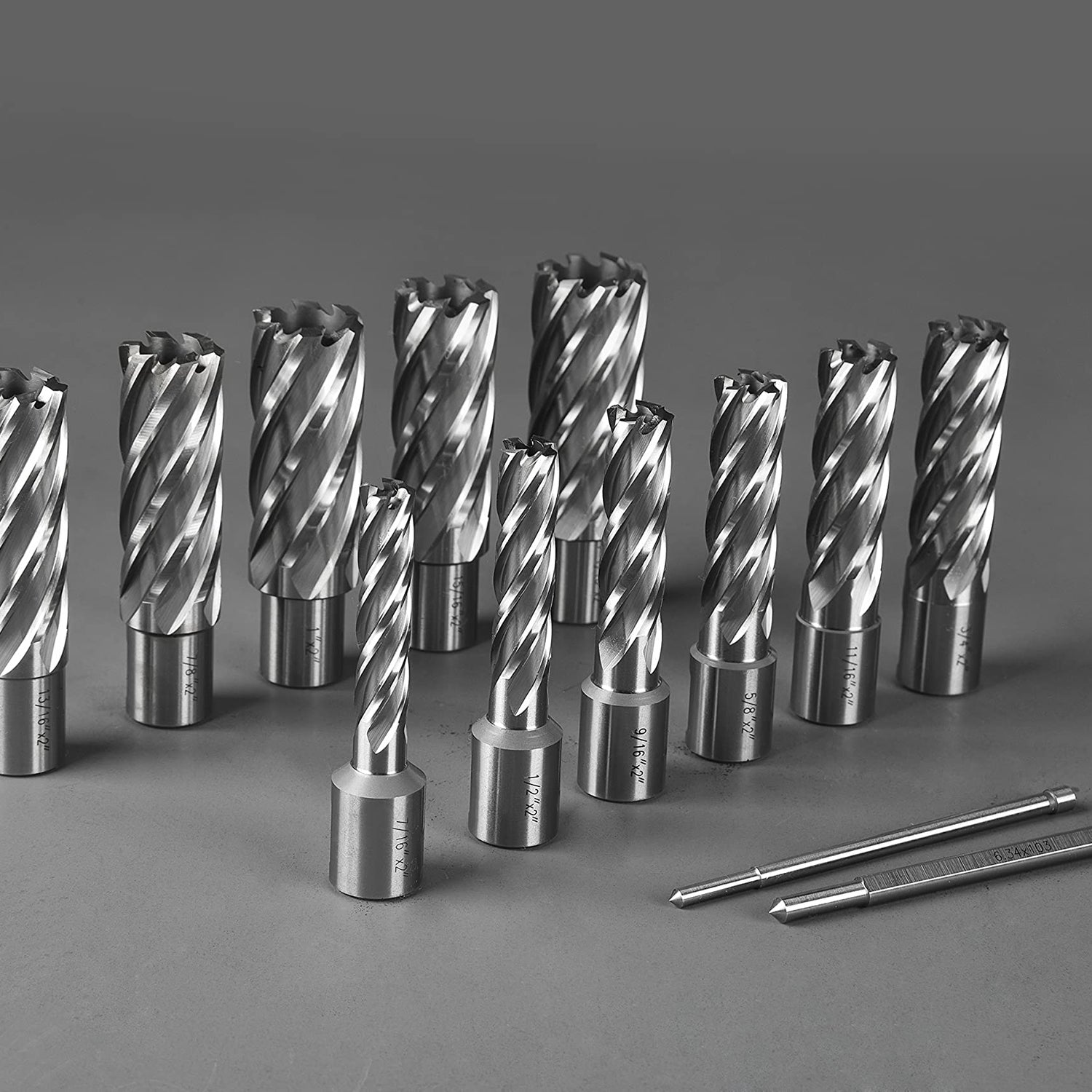 Annular Cutter Set 13 pcs JESTUOUS 3/4 Inch Weldon Shank 2 Cutting Depth and Cutting Diameter from 7/16 to 1-1/16 for Drill Press HSS Standard Kit Two Flat with 2 Pilot Pins