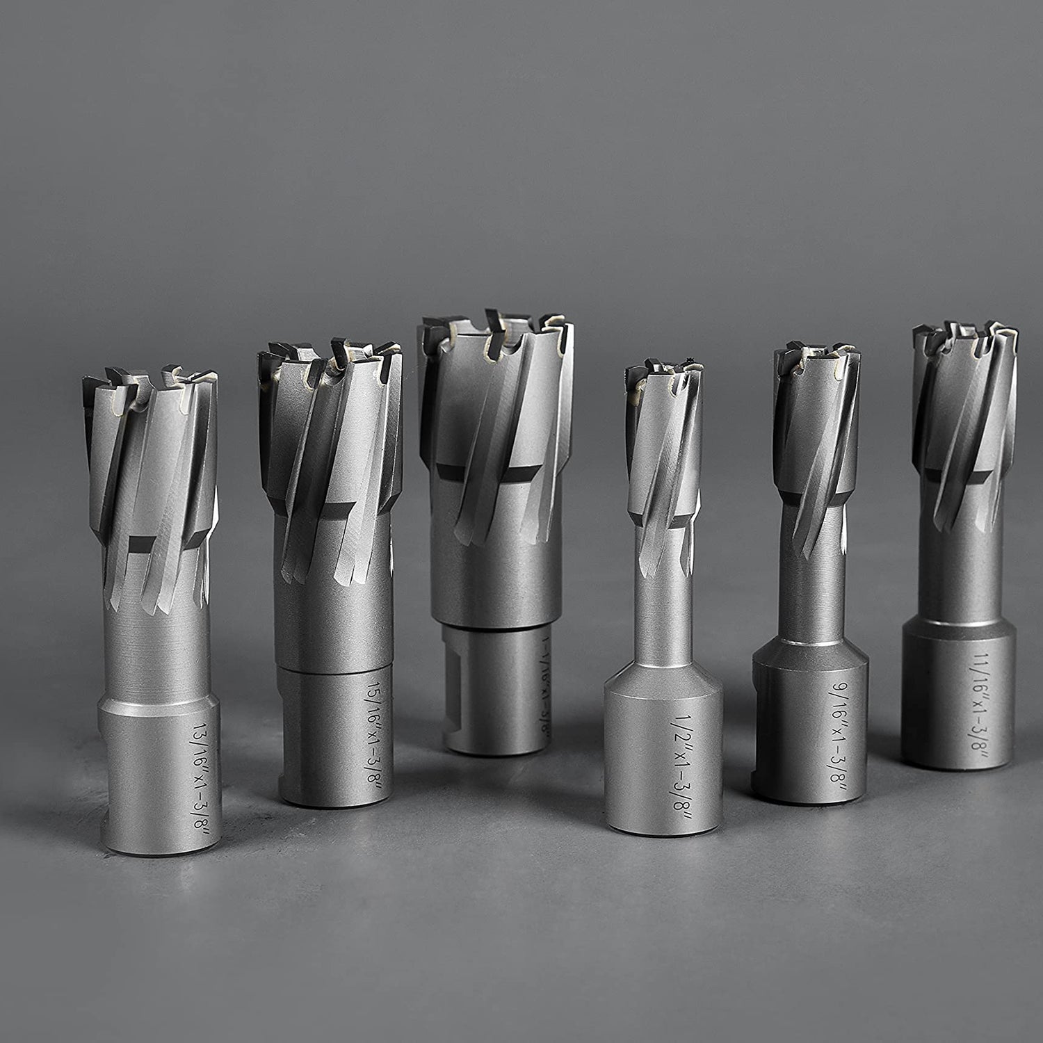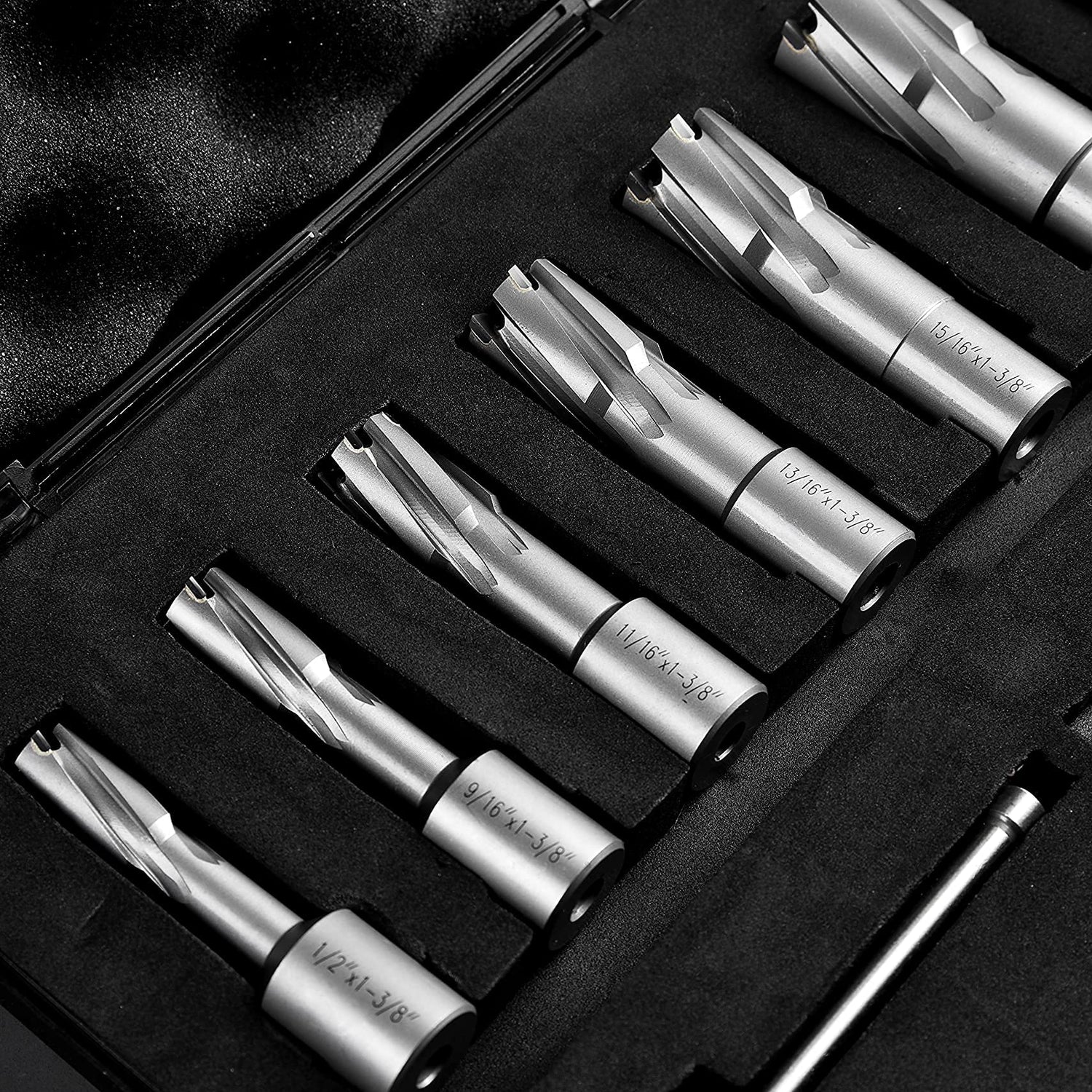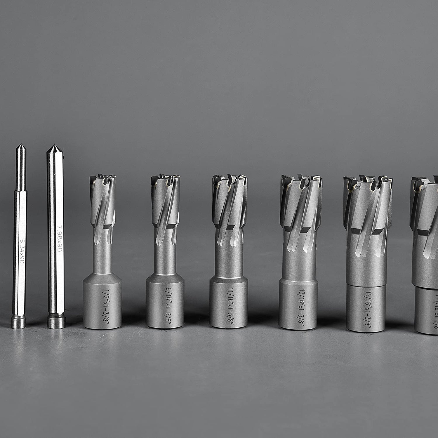Annular Cutter Set Carbide 8pcs JESTUOUS 3/4 Inch Weldon Shank 1-3/8 Cutting Depth and Cutting Diameter from 1/2 to 1-1/16 Two Flat TCT Bit for Drill Press with 2 Pilot Pins