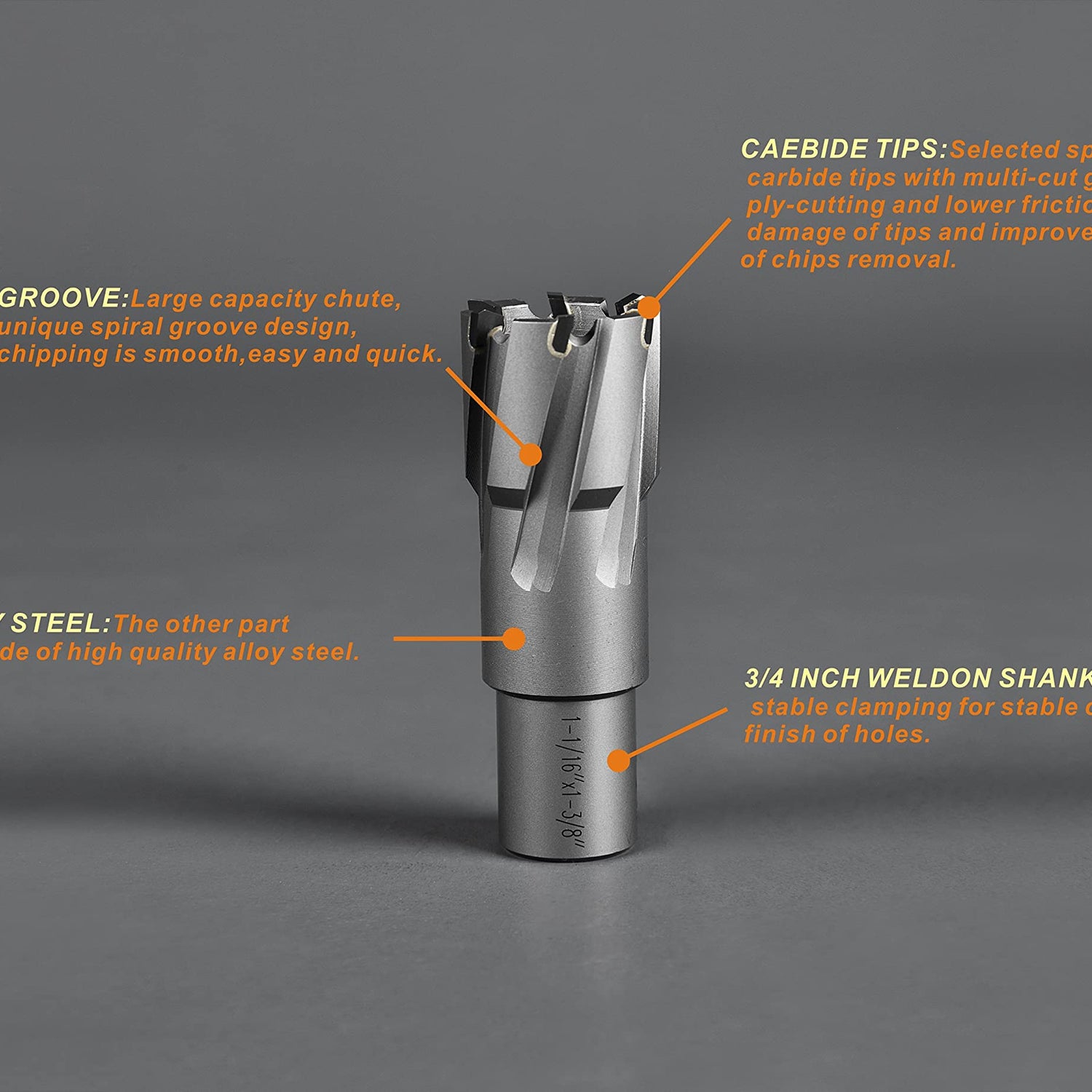 - 『Carbide Tips』Tungsten carbide tipped weldon shank annular cutter, 6 carbide tips with silver soldering,the other part are alloy steel,sharper than HSS annular cutters.