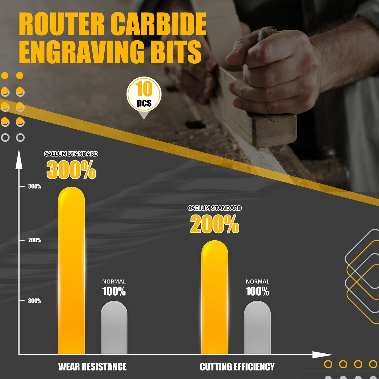 • 10 PCS ROUTER CARBIDE ENGRAVING BITS: HSS Router Carbide Engraving comes with 10 most useful router bit types, including trimming, straight drill, bead drill, groove drill, slot cutter, V-groove, etc., to meet your needs for detail engraving