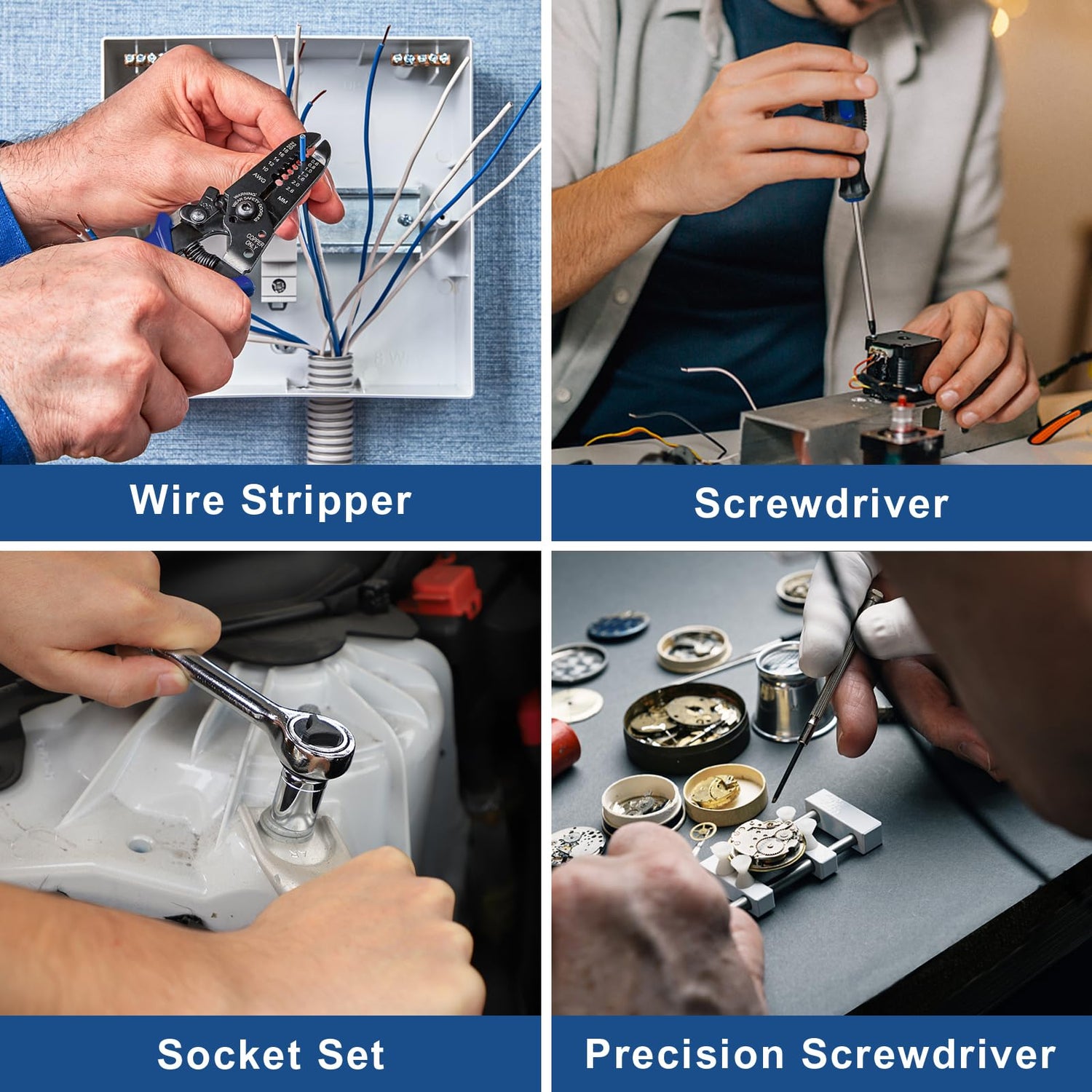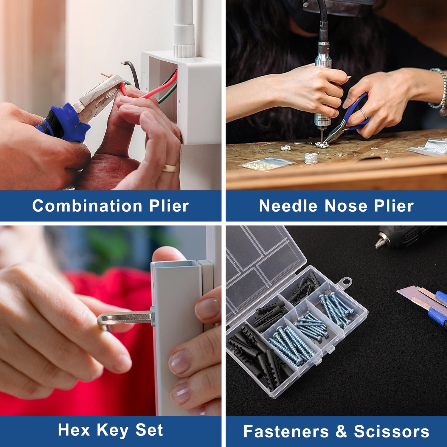 - 【MULTI-PURPOSE HOUSEHOLD TOOLS】 This tool set for home contains the most useful hand tools for repairing or maintaining precision electronics projects and hardware upgrades. Claw hammer, hand saw, plumbing pliers,long-nose pliers, wrench, tape measure (10ft) , paper cutter, sockets, screwdriver and screwdriver bits. Perfect tool sets for homeowners: tightening screws, assembling furniture, putting up curtain rods and so on.