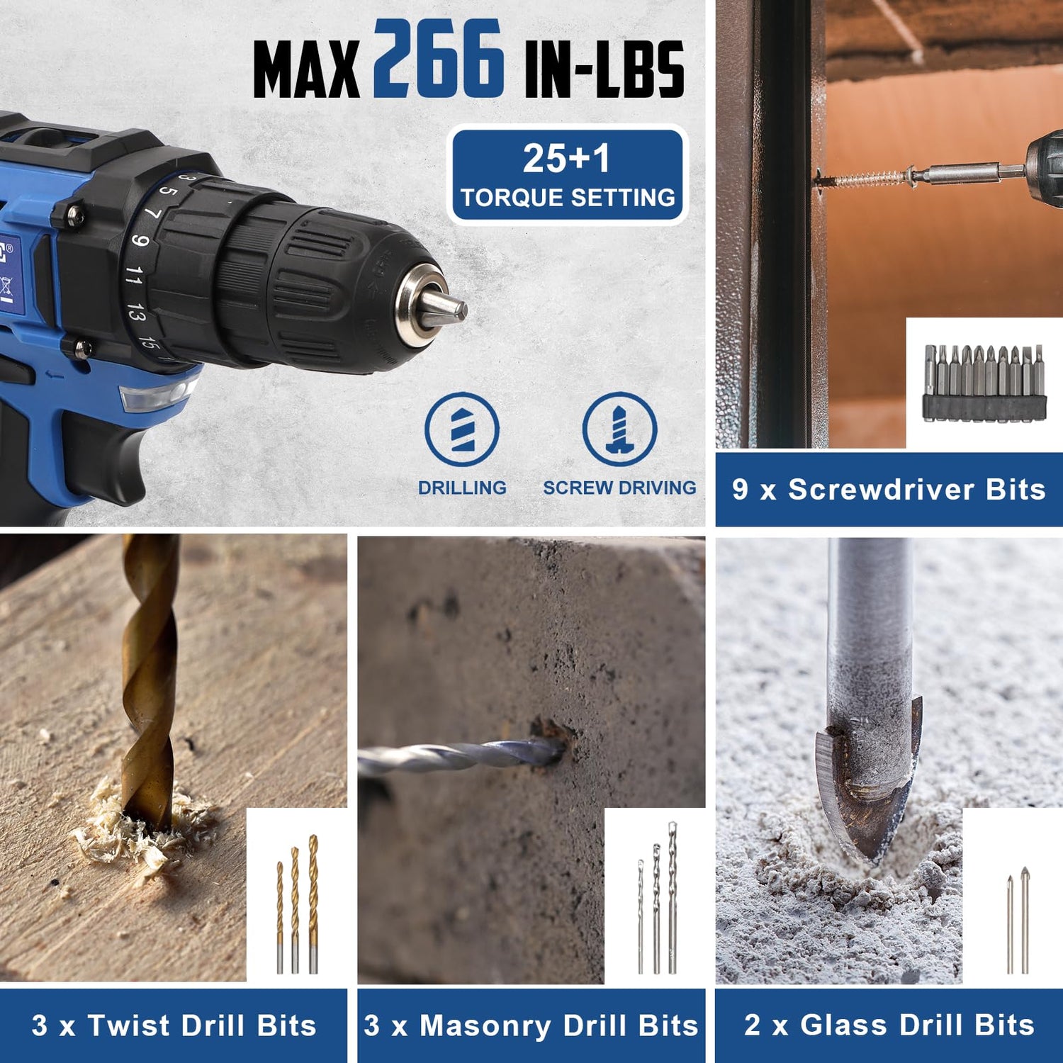 - 【20V POWER DRILL & 2.0 Ah BATTERY】 The 20V cordless power drill is powered by a 2.0Ah high-capacity lithium ion battery for longer working hours. A 2.5-hour charger is included. The electric drill features 3/8" (10mm) keyless chuck and 25+1 torque setting with max 266 in-lbs torque. It holds the bits tight without falling off. 2 variable speed (0-350RPM and 0-1300RPM) allows you to easily control the drilling speed.