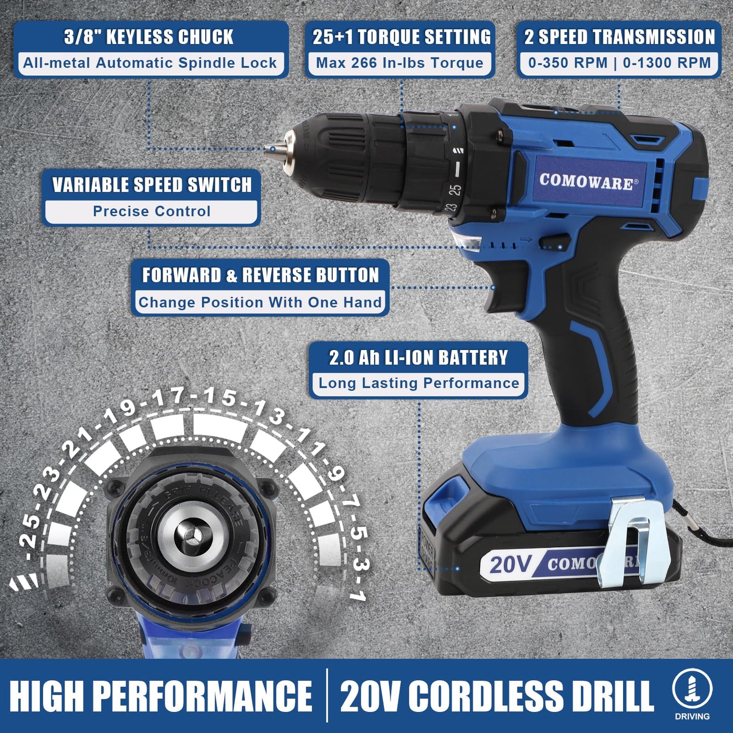 COMOWARE 120 Pcs Home Tool Kit with Drill, 20V Power Tool Combo Kits with 2.0 Ah Li-ion Battery & Charger, 25+1 Clutch, Tool Sets for Men, Household Tool Set for Garden Office Home Repair, Blue Case