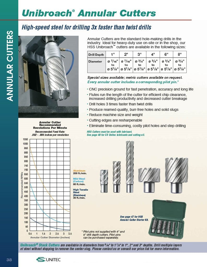 Details: Annular Cutters are the standard hole-making drills in the industry. Ideal for heavy-duty use on-site or in the shop, our HSS Unibroach cutters are CNC precision ground for fast penetration, accuracy and long life. Flutes run the length of the cutter for efficient chip clearance, increasing drilling productivity and decreasing cutter breakage. Drill holes 3 times faster than twist drills. Produce reamed-quality burr-free holes and solid slugs. Reduce machine size and weight. Cutting edges are resharpenable. Eliminate time-consuming, costly pilot holes and step drilling. Every annular cutter up to 4" depth comes with a corresponding pilot pin included. HSS Cutters must be used with lubricant. Click on the CS Unitec link at the top of this page to see more industrial quality products from CS Unitec.