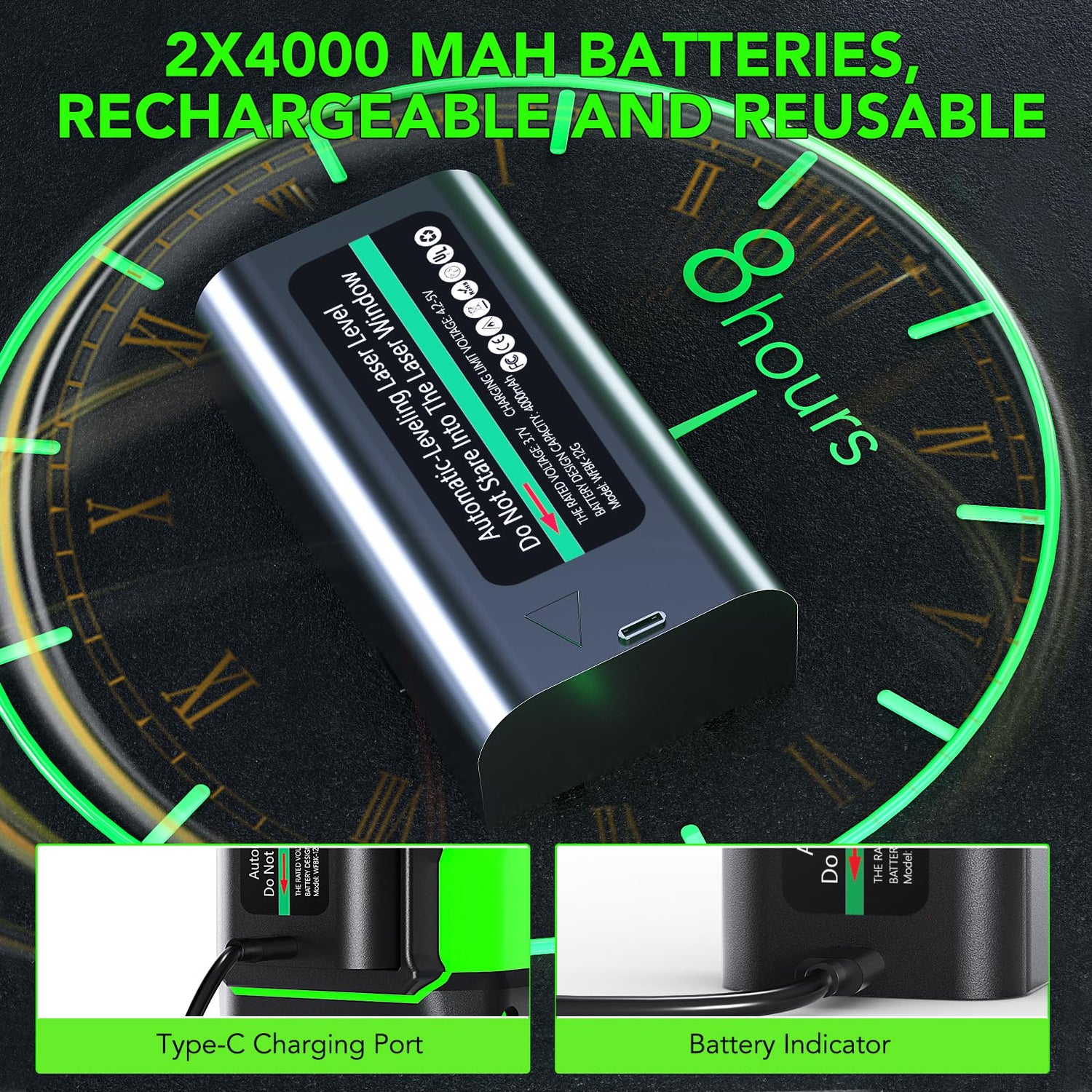 • 【Multifunctional & Type-C Charging Port】With an overmolded housing and IP54 rating against dust and splashes, this 360 laser tool features 2x 4000mAh battery for easy on-the-go and replacement, with a Type-C charging port that can also be charged with laptops, power banks, car chargers and more.