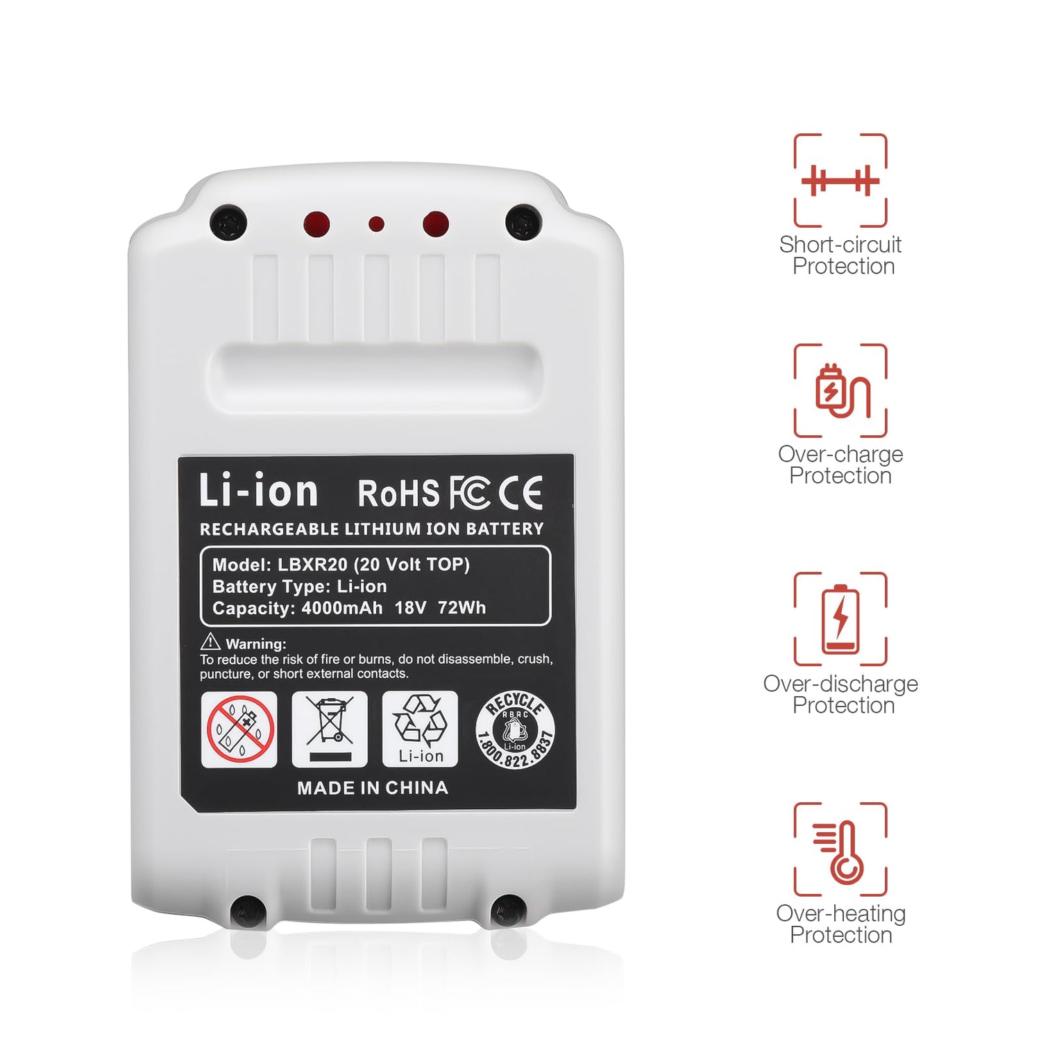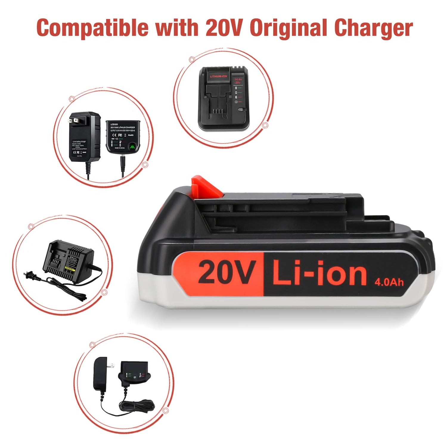 - 【Perfect Compatibility】For Black and Decker Tools,The battery is compatible with Black and Decker cordless tools - drill, weed wacker, charger, dustbuster ect.(LBXR20 LBXR20 LB20 LBX20 LBX4020 LB2X4020 LBXR2520 LST300 LBXR2020 LB2X3020 LB2X4020 ect.)For Compatible with Black & Decker Charger,The Battery can adapt to Black and Decker 20V MAX lithium battery charger - LCS1620B BDCAC202B.