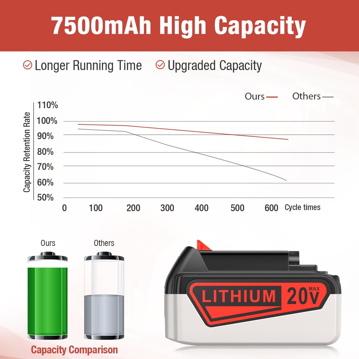 - 【Battery Specification】Battery Type: Lithium Ion| Voltage: 20V | Capacity: 7500mAh | Upgraded Replacement for Black and Decker 20V max lithium battery, longer running time than others 6000mAh.