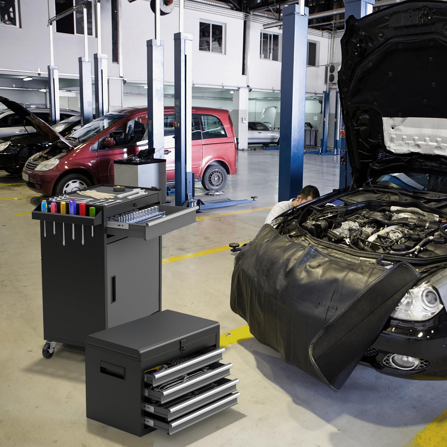 - 【Universal Wheels with Brakes】This tool chest has four flexible universal wheels, and two of them have braking function. A locking bar will prevent the drawers from sliding out and the cabinet door from opening while rolling.