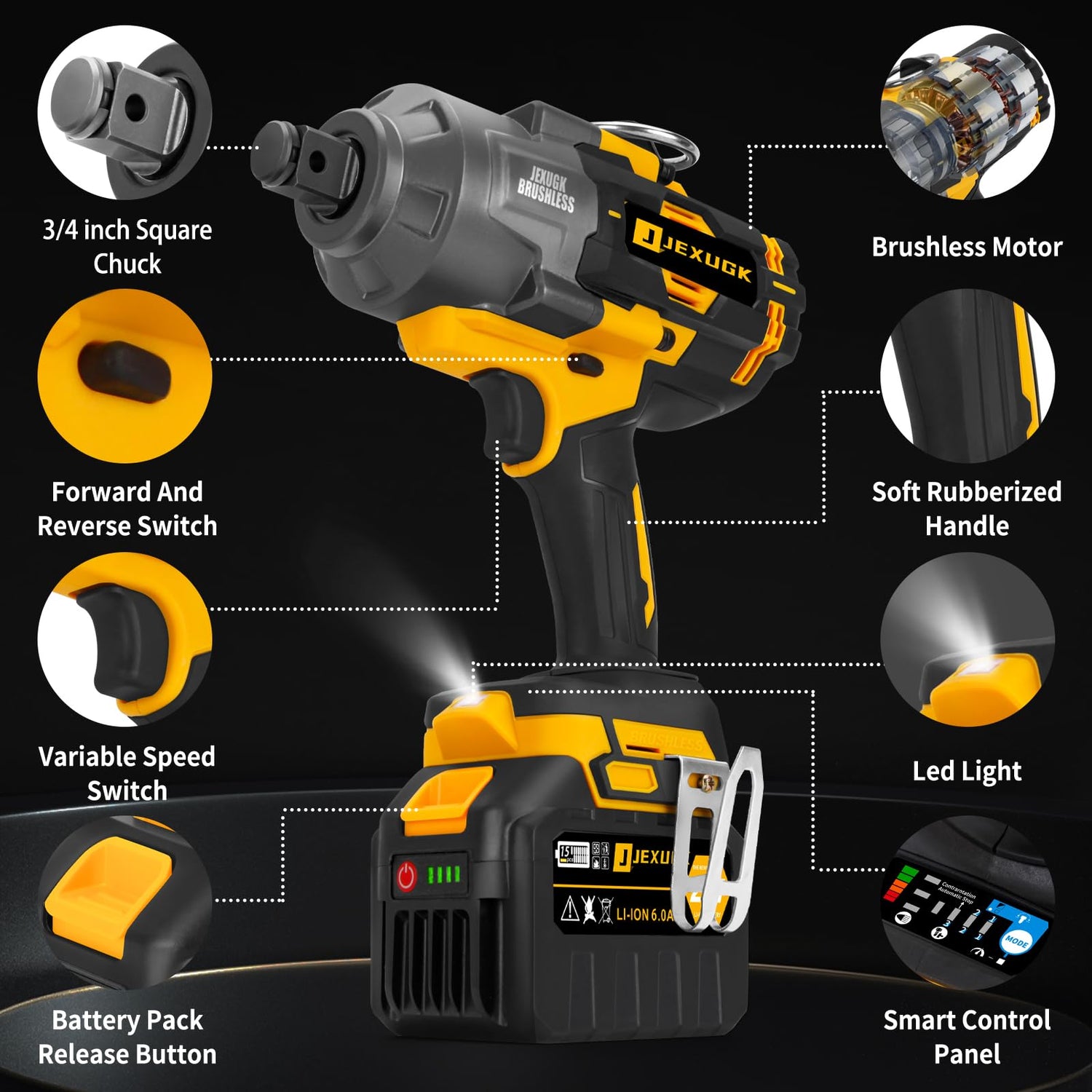 Details: JEXUGK 2000Nm Heavy Cordless Impact Wrench, 3/4" To 1/2" High Torque Impact Gun with 2 x 6.0AH Battery, 1500Ft-lbs Brushless Pistola de Impacto, Power Llave de Impacto for Truck Mower Car 2000N.M HEAVY DUTY WORK WRENCH! - The most powerful thing about JEXUGK's 3/4 inch battery impact gun is its peak torque of 2000N.m (1500ft-lbs). Paired with a high-torque brushless motor for longer life and power, it's designed for heavy-duty work and will run efficiently on large construction projects, heavy equipment maintenance, farm machinery, pickups, trucks RVs, auto repairs and more. And will beat 99.99% of power impact wrenches on the market