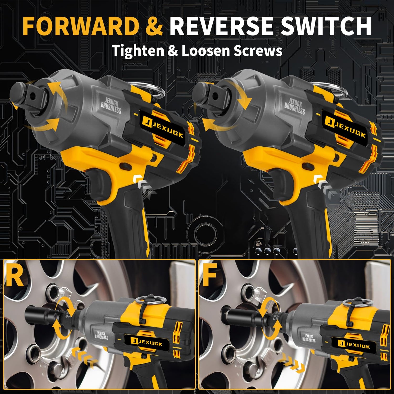 • MEETS 99.99% OF JOB DEMANDS - The JEXUGK electric impact gun has an impressive 1500 ft. lbs. of torque and is designed for heavy-duty work, unloading truck tires, replacing lawn mower blades, automotive repairs, heavy equipment maintenance, large construction projects, architectural steelwork, scaffolding, DIY carpentry, home repairs, or product assembly. Everything can be done in a fraction of a second with just a pull of the impact driver's 3/4-inch trigger