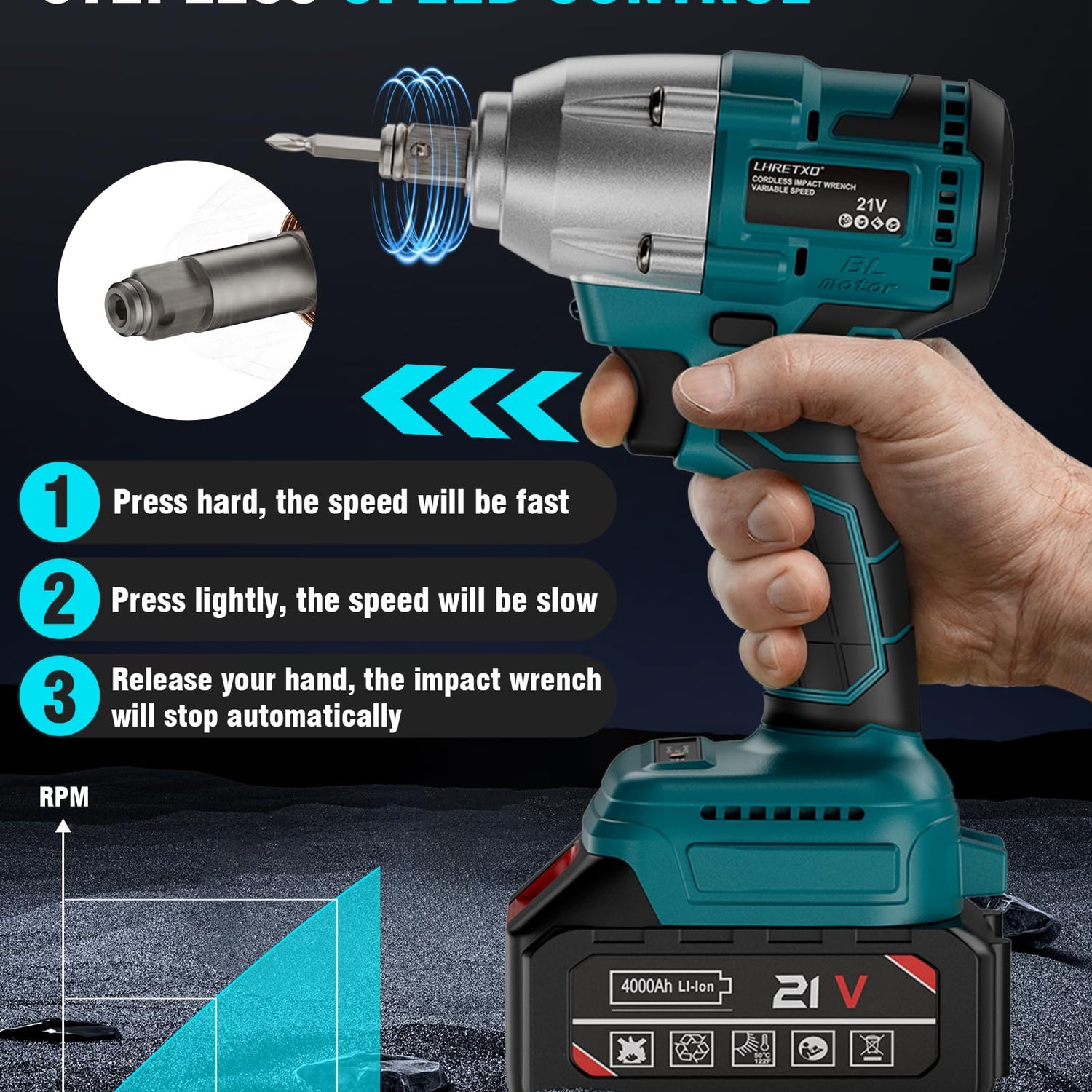 - REVERSE AUTO-STOP FUNCTION - The electric impact wrench automatically stops the rotation once the fastener is loosened, preventing the stripping or damaging bolts and nuts. Press the switch in reverse mode, and the auto-stop function will on/off. Automatic stop simplifies the process, saving time and effort, and reducing the need for rework or readjustments.