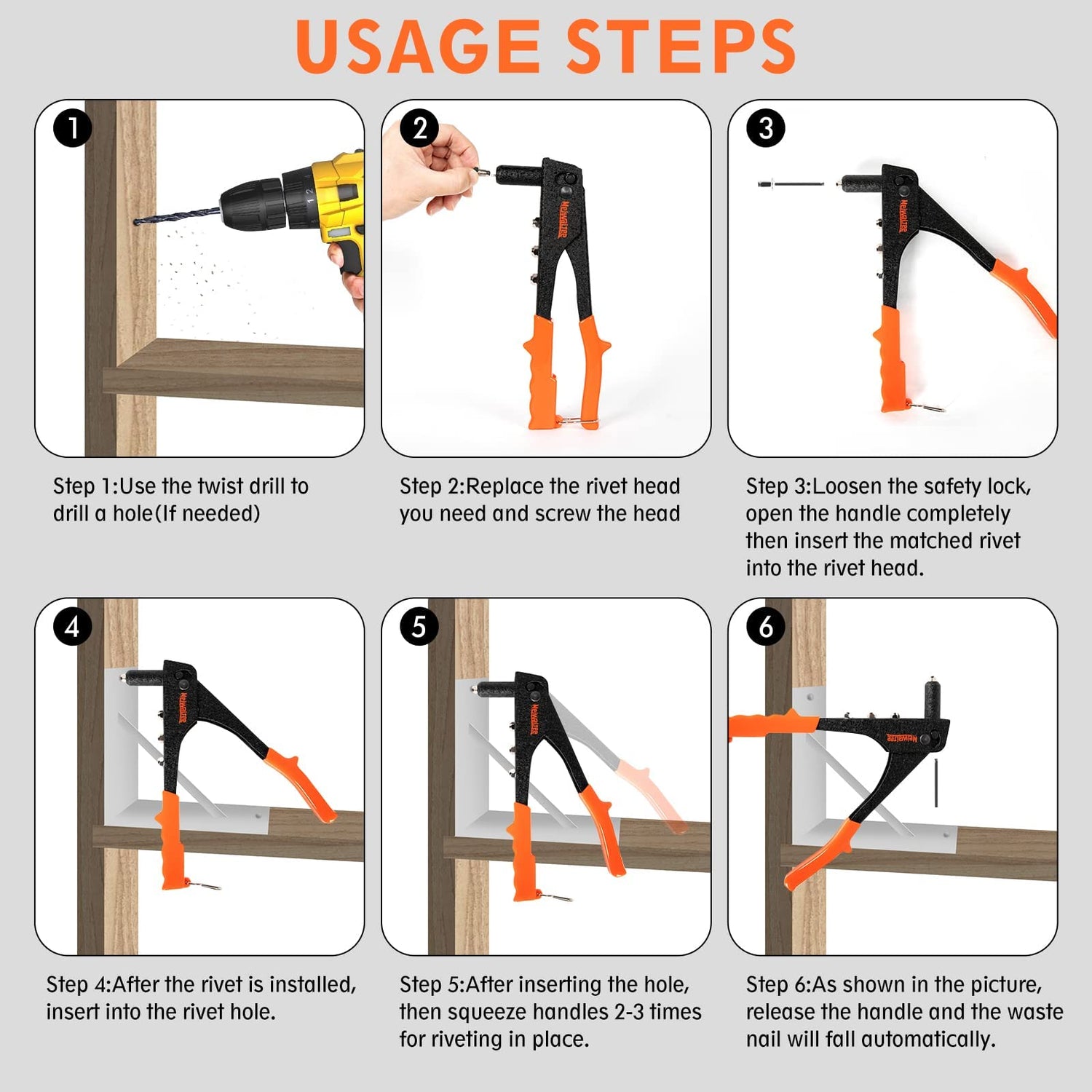 - đ¨ăMore Sturdy And DurableăMeiwaltee pop rivet gun is made of heat-treated 0.08inch(2MM) thickened carbon steel. note: be sure to match right interchangeable heads and rivets size to work to prevent from the jam.