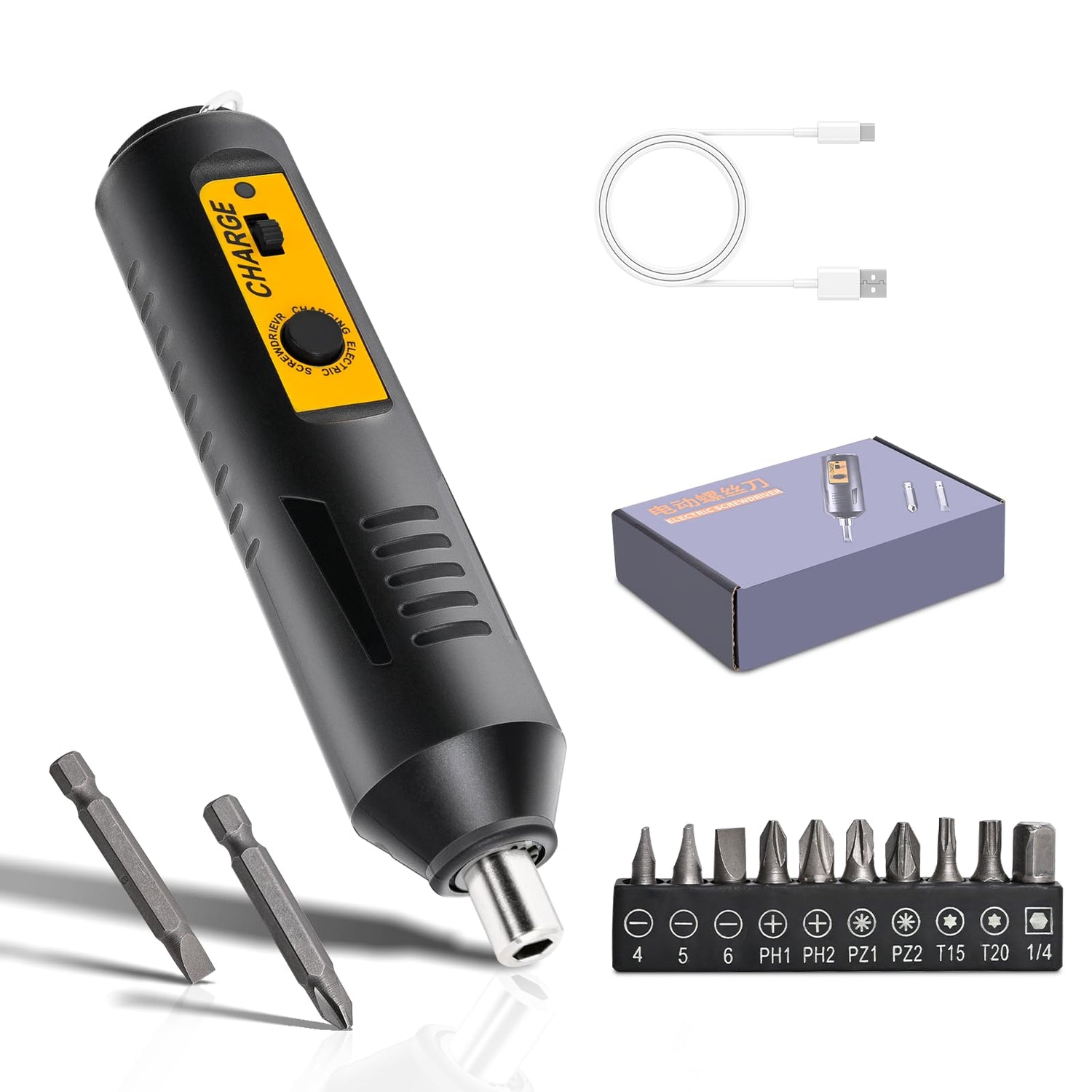 - 【Package include】The cordless screwdriver drill set contains 1*JULIXIN cordless screwdriver, 10*Screwdriver bits set,2 extended bits, , 1*type-c cable,1*storage box.