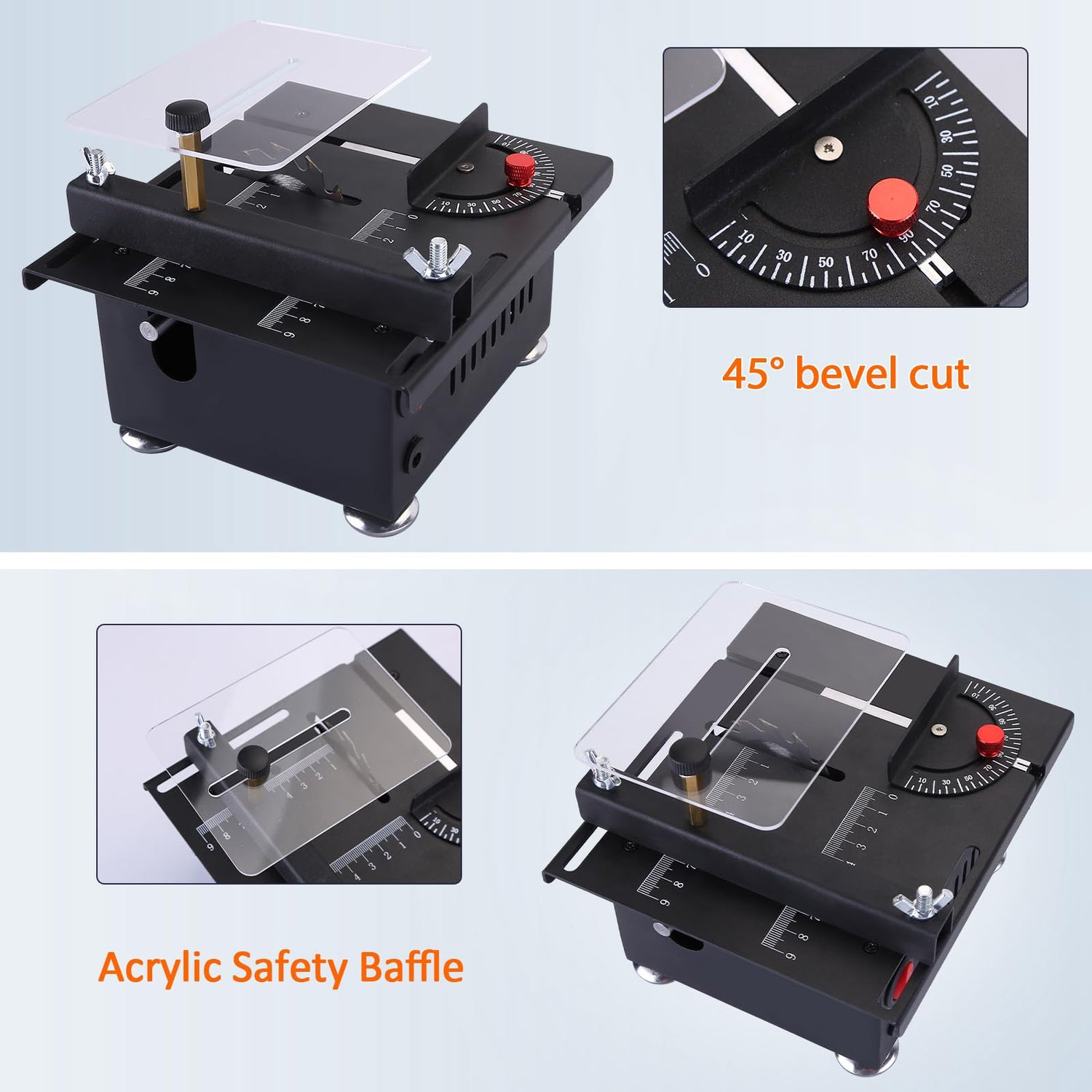 • 【Accurate cutting】The desktop saw panel has clear markings for stable, accurate, and straight cutting. Integrated cast iron body, sturdy and durable, suitable for long-term use. Transparent baffles prevent the splashing of debris. The bottom four corners are equipped with anti slip and shock-absorbing rubber feet to ensure that they do not shift during operation. Equipped with a soft shaft, it can hold drilling heads with a shank diameter of 0.5-3.2mm.