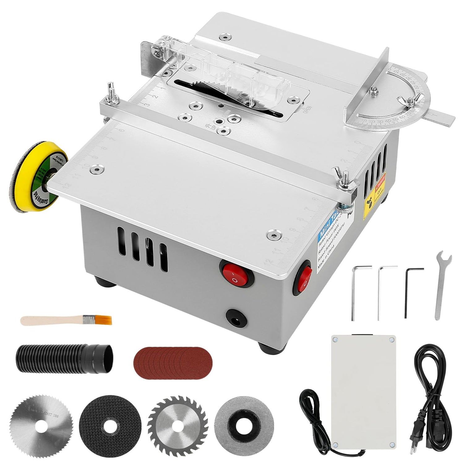 Mini Table Saw with Belt Grinder, 7-Speed Power Supply Adjustable Table Saw Portable Precision Table Saw with 4-Blades and Safety Flap, 0.1-20mm Saw Blade Height Adjustable, Aluminum