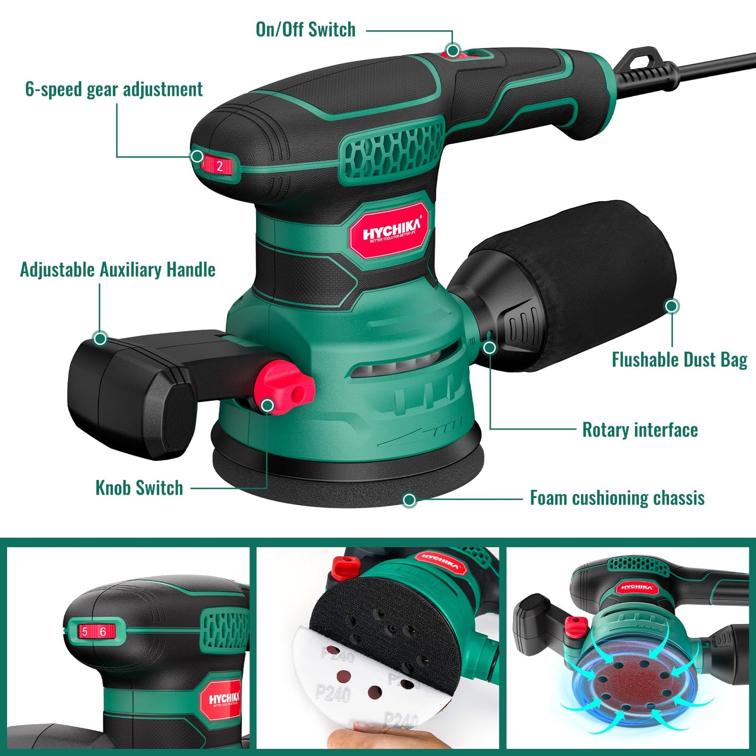 Details: 3.8A 450W Orbital Sander, HYCHIKA 6 Variable Speeds Double Handle Random Orbit Sander, 5-Inch Electric Sander with 20pcs Sandpapers, Dust Collector, Ideal Power Sander for Woodworking